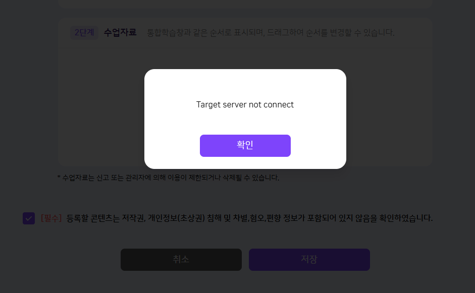 | Description | 등교 수업 생성 시 "Target server not connect" 에러 발생 및 수업 생성 되지 않는 현상입니다. | ||||