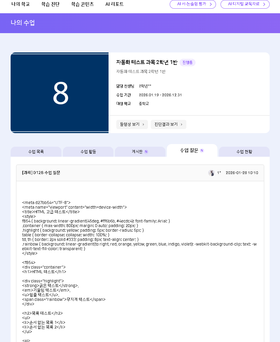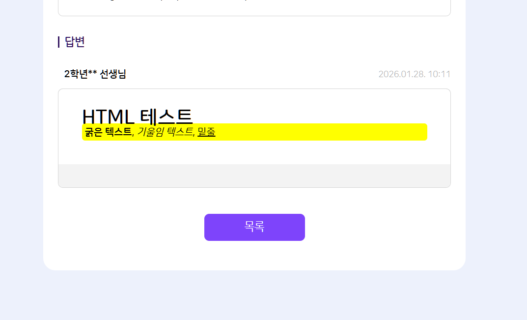 | Steps To Reproduce | 1. 수업 질문 등록 (학생) 2. 수업 답변에 html 양식 적용 (교사) 3. 학생으로 답변 내용 확인 | ||||