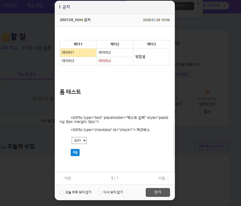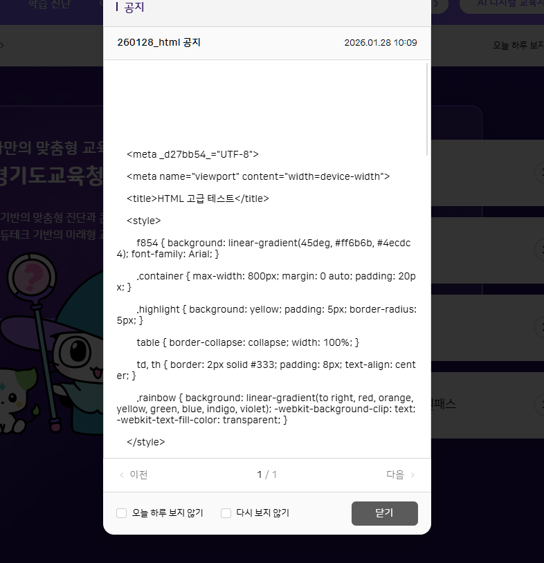 | Steps To Reproduce | 1. html 양식으로 업로드한 공지 팝업 확인 2. 260128_html 공지 (TB) | ||||