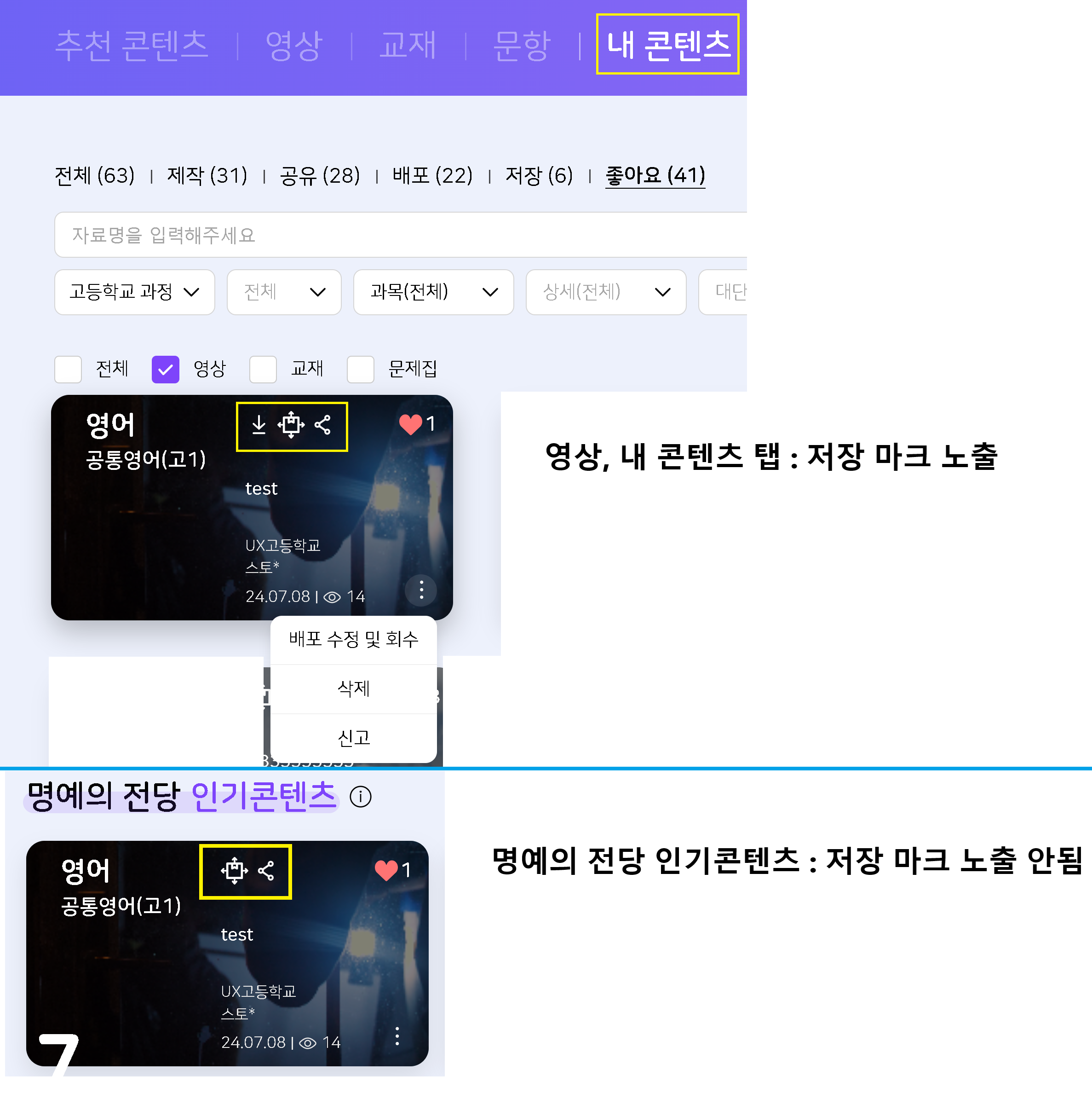 | Description | 명예의 전당 인기콘텐츠에 노출된 콘텐츠 저장 했을 시 추천 콘텐츠에서는 저장 마크 노출 안되고 내 콘텐츠에서는 저장 마크 노출 됨 | ||||