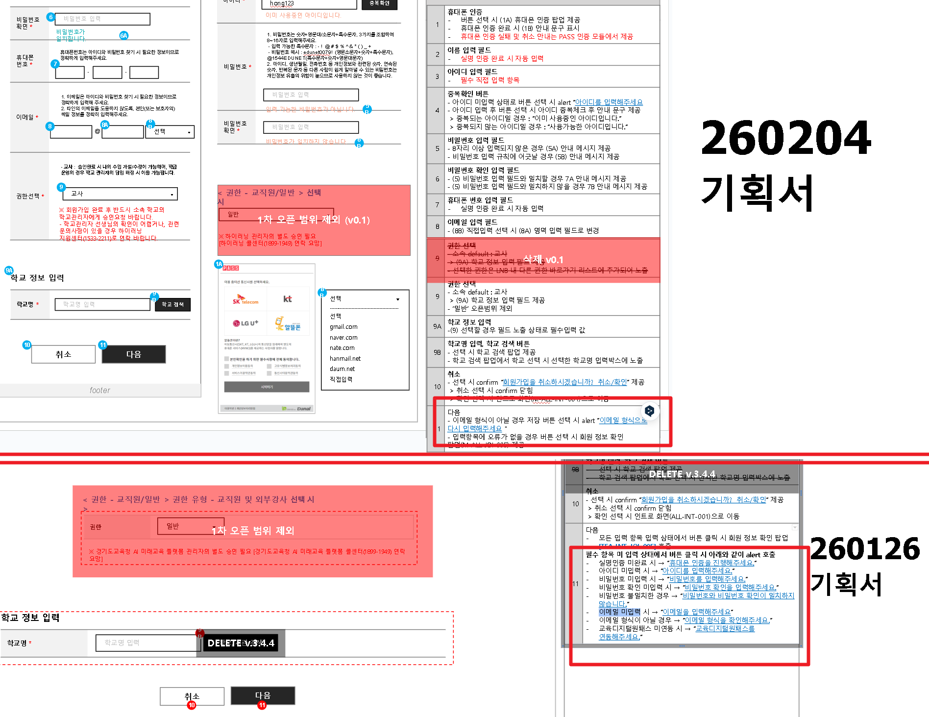 | Description | 회원가입 - 회원정보 입력 후 [다음] 버튼에 대한 설명이 신규 기획서에서 삭제되어 기획 문의 드립니다. main&report 260126 에서는 [다음] 버튼 클릭시 필수 항목 미입력 상태에 따른 확인 텍스트 안내가 있음 main&report 260204에서는 [다음] 버튼 클릭시 필수 항목 미입력 상태에 따른 확인 텍스트 안내가 삭제됨 기획서에서 해당 문구 안내가 삭제되었는데 실제 동작에도 변동이 있는지 문의드립니다. | ||||
