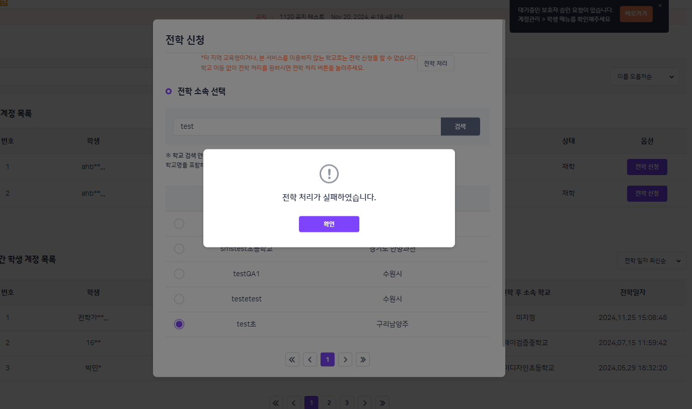 | Description | 전출 : DB변경 도중 에러발생 팝업 노출 전학 : 전학 처리가 실패하였습니다. 팝업 노출 | ||||