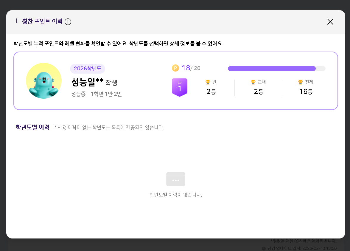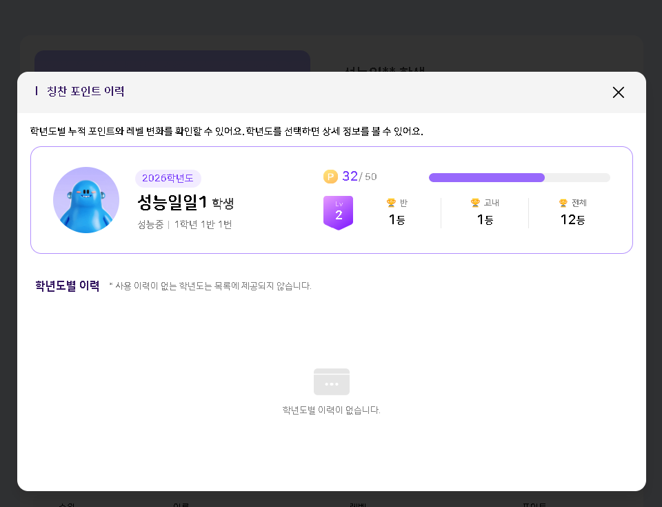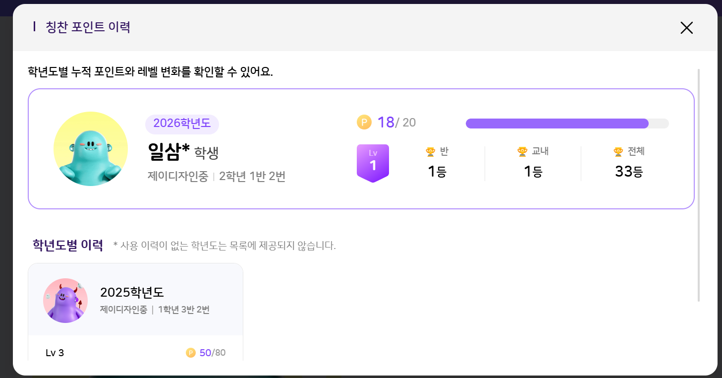 | Steps To Reproduce | 학생 : 나의 프로필 레벨 > 칭찬 포인트 이력 > 학생 정보 영역에 이름 확인 | ||||