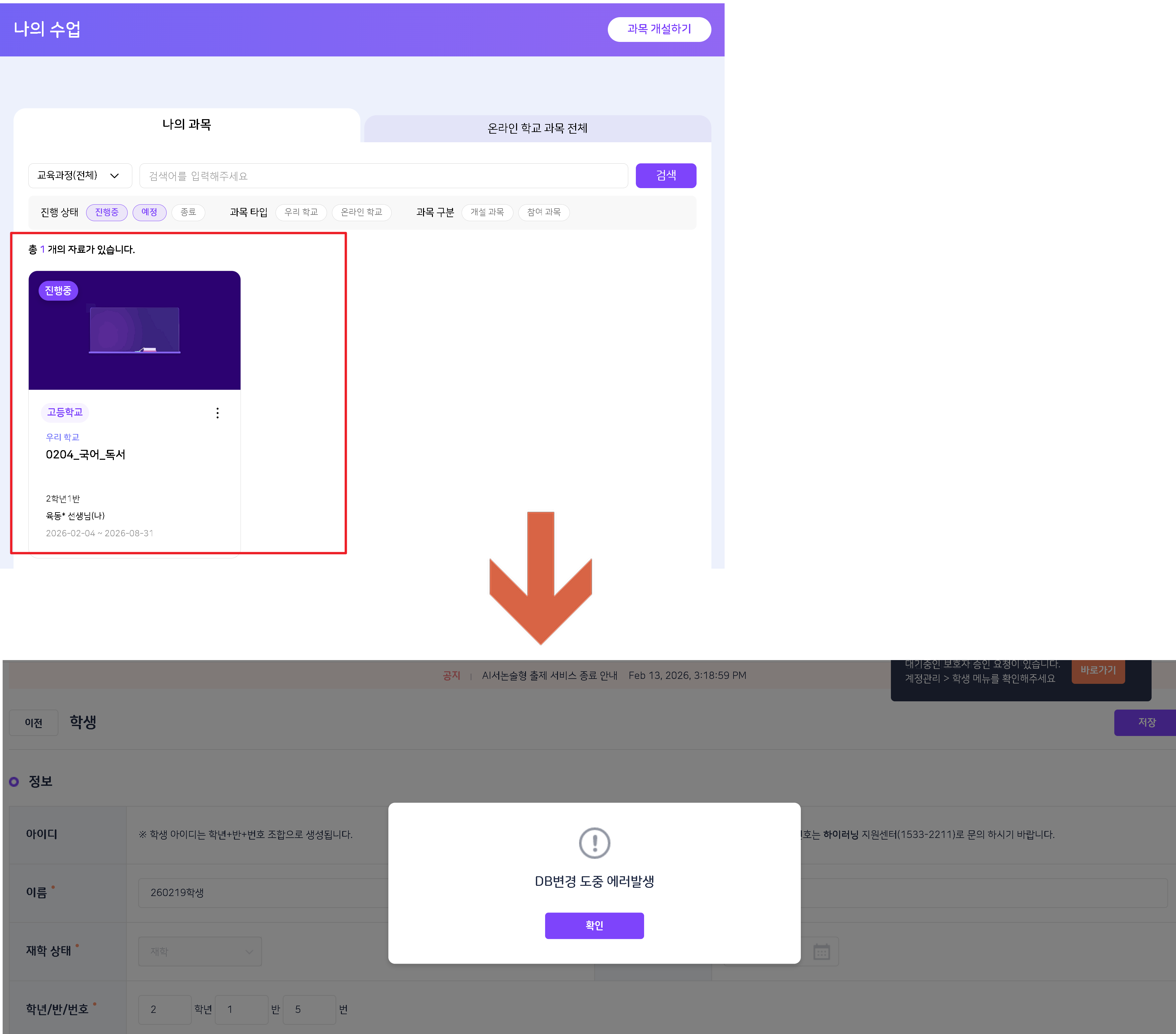 | Description | [voc][학년도전환]과목을 생성한 교사가 학교BO에서 학생 추가시 error발생하는 현상. * TB에서는 정상 동작하지만, 상용에서만 발생하는 이슈입니다. | ||||
