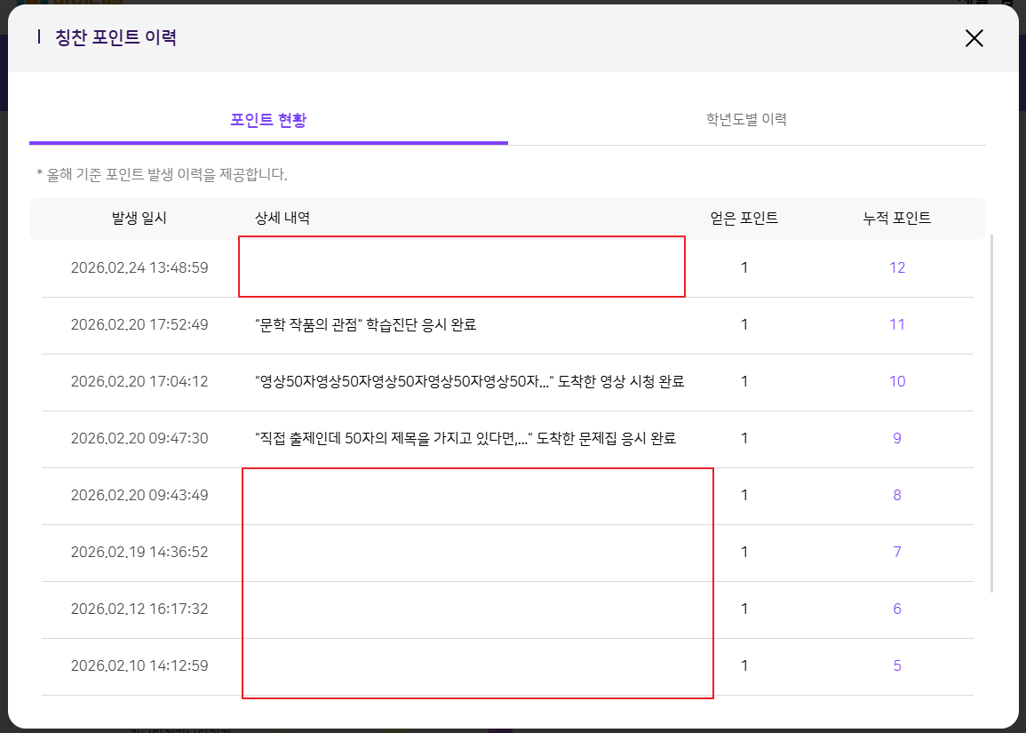 | Description | 칭찬포인트 이력 팝업에서 학생의 포인트 상세 내역 텍스트가 출력되지 않는 현상입니다. | ||||