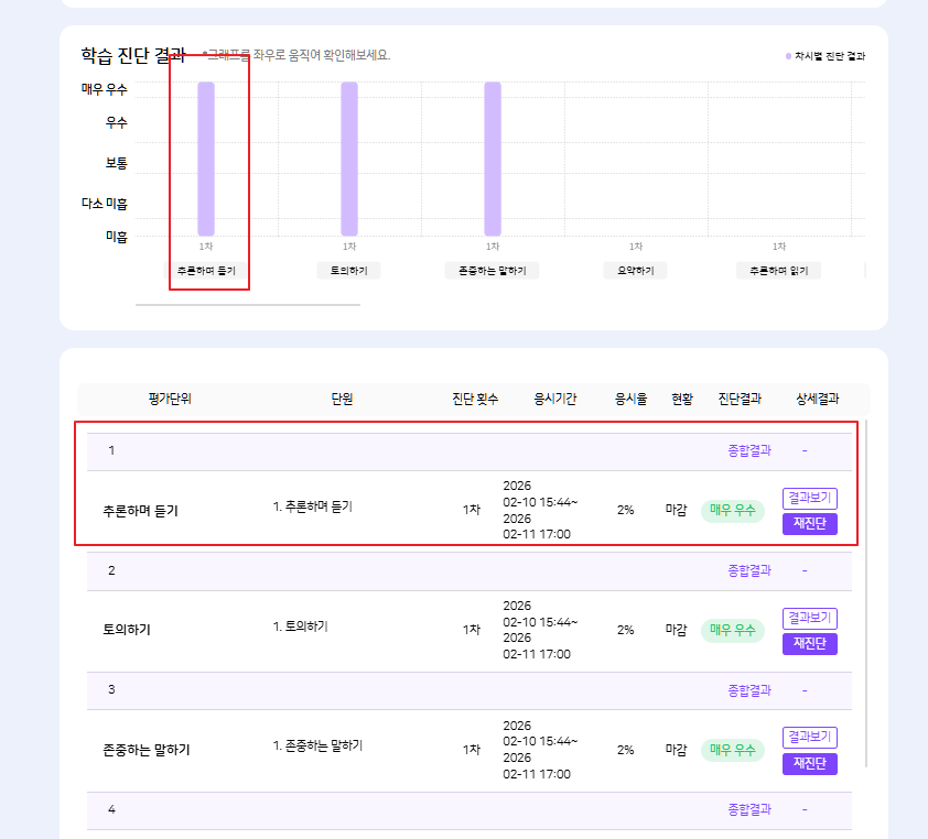 **AI 학습 진단** "code": 200, "message": "Success", "result": [ { "evalUnitNo": 1, "maxOrd": 3, "evalUnitSeq": 1593, "evalUnitNm": "추론하며 듣기", "arNm": "국어", "depthone": { "evalUnitSeq": 1593, "evalUnitCatnm": [ "추론하며 듣기" ] }, "catFrmtEvalList": [ { "wrkbkSeq": 0, "prbmCatId": 0, "distTrgtSeq": 364736, "frmtEvalOrd": 1, "startDttm": "2026-02-10 15:44", "endDttm": "2026-02-11 17:00", "subjNm": null, "larcatNm": null, "aplctRate": 2, "cnddtStuCnt": 1, "totalStuCnt": 51, "pointAvg": 100, "cnddtYn": null, "mbrSe": "01", "mbrSeq": 1512039, "frmtEvalOrdSeq": null, "cmpltYn": null, "evalUnitSeq": 1593, "evalUnitNm": null, "confirmDt": null, "maxOrd": 3, "ddayNm": "마감" } ] }, { "evalUnitNo": 2, "maxOrd": 3, "evalUnitSeq": 1594, "evalUnitNm": "토의하기", "arNm": "국어", "depthone": { "evalUnitSeq": 1594, "evalUnitCatnm": [ "토의하기" ] }, "catFrmtEvalList": [ { "wrkbkSeq": 0, "prbmCatId": 0, "distTrgtSeq": 364736, "frmtEvalOrd": 1, "startDttm": "2026-02-10 15:44", "endDttm": "2026-02-11 17:00", "subjNm": null, "larcatNm": null, "aplctRate": 2, "cnddtStuCnt": 1, "totalStuCnt": 51, "pointAvg": 100, "cnddtYn": null, "mbrSe": "01", "mbrSeq": 1512039, "frmtEvalOrdSeq": null, "cmpltYn": null, "evalUnitSeq": 1594, "evalUnitNm": null, "confirmDt": null, "maxOrd": 3, "ddayNm": "마감" } ] }, { "evalUnitNo": 3, "maxOrd": 3, "evalUnitSeq": 1595, "evalUnitNm": "존중하는 말하기", "arNm": "국어", "depthone": { "evalUnitSeq": 1595, "evalUnitCatnm": [ "존중하는 말하기" ] }, "catFrmtEvalList": [ { "wrkbkSeq": 0, "prbmCatId": 0, "distTrgtSeq": 364736, "frmtEvalOrd": 1, "startDttm": "2026-02-10 15:44", "endDttm": "2026-02-11 17:00", "subjNm": null, "larcatNm": null, "aplctRate": 2, "cnddtStuCnt": 1, "totalStuCnt": 51, "pointAvg": 100, "cnddtYn": null, "mbrSe": "01", "mbrSeq": 1512039, "frmtEvalOrdSeq": null, "cmpltYn": null, "evalUnitSeq": 1595, "evalUnitNm": null, "confirmDt": null, "maxOrd": 3, "ddayNm": "마감" } ] }, |