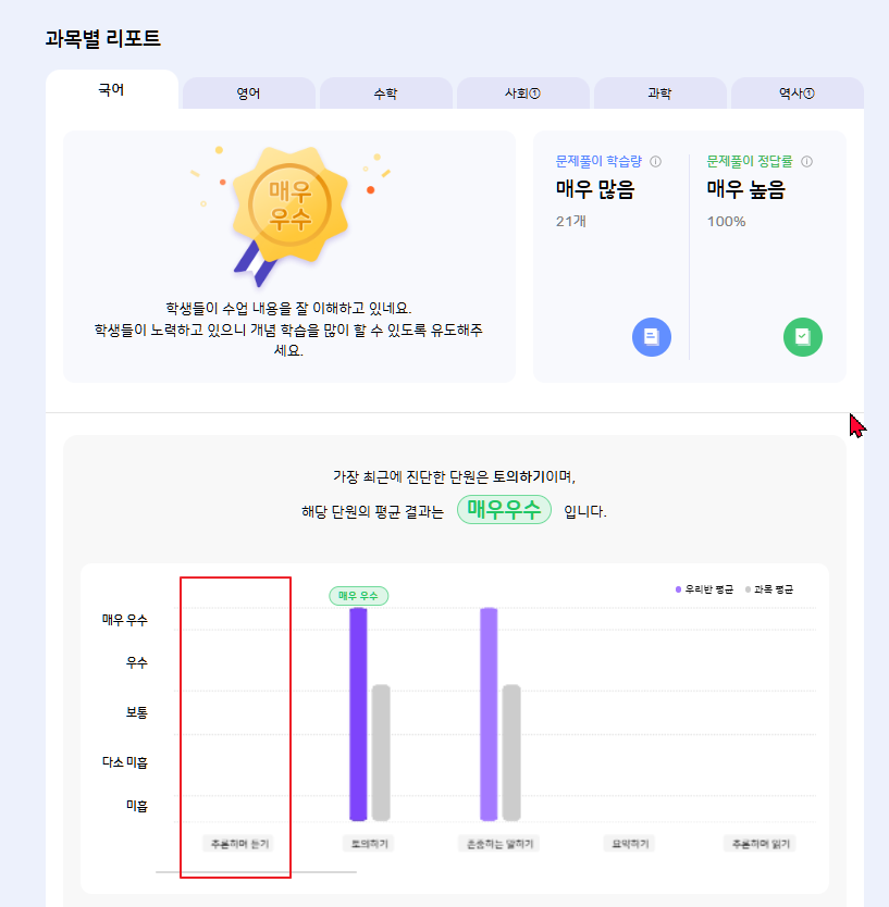 | Steps To Reproduce | 1. 25test1 계정 접근 2. AI학습 진단 > 국어 영역 확인 3. AI리포트 국어 영역 비교 | ||||