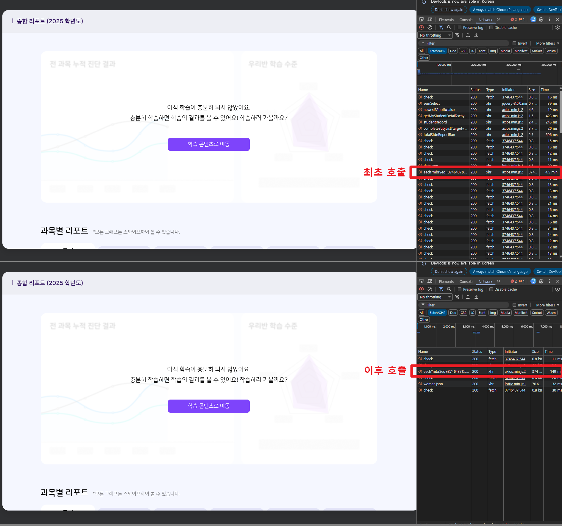 해당 기능은 학생별로 최초 호출시에만 지연이 발생, 이후 호출시엔 응답속도 정상입니다. 최초 호출 시 : 키보코에서 모든 분류체계에 대한 학습 데이터 조회하여 하이러닝에 저장. 이후 호출 시 : 하이러닝에 저장된 데이터 조회하므로 호출 속도 정상. |
