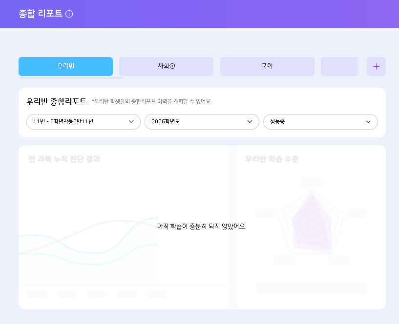 | Steps To Reproduce | 1. 교사 로그인 2. 종합 리포트 > 데이터 없는 학생 선택 3. 노출 화면 확인 | ||||