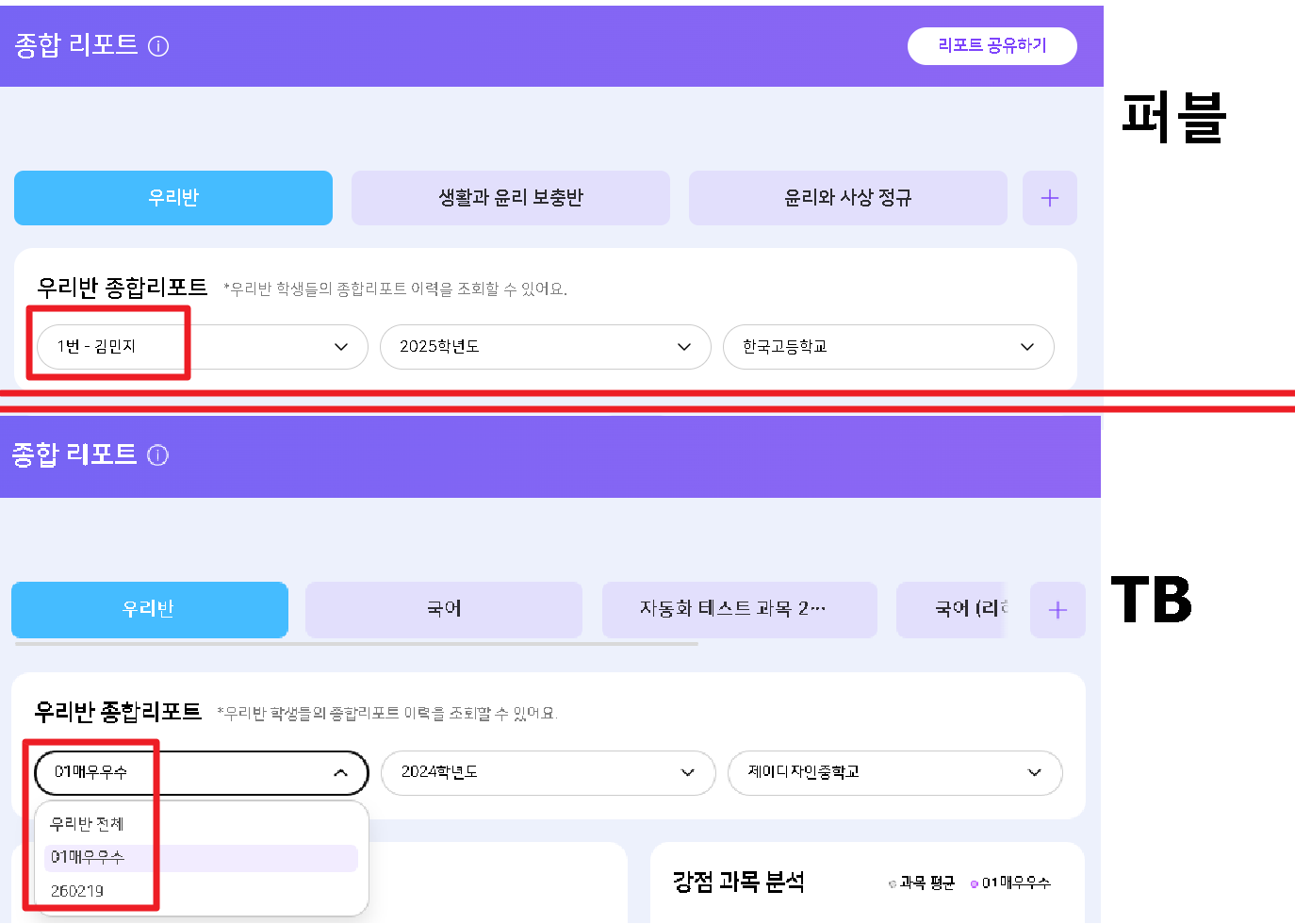 | Description | [FO][종합리포트 이력]종합리포트 학생 선택 드롭다운이 퍼블과 상이 퍼블 : "0번 - 000" 형식 노출 TB : "000" | ||||