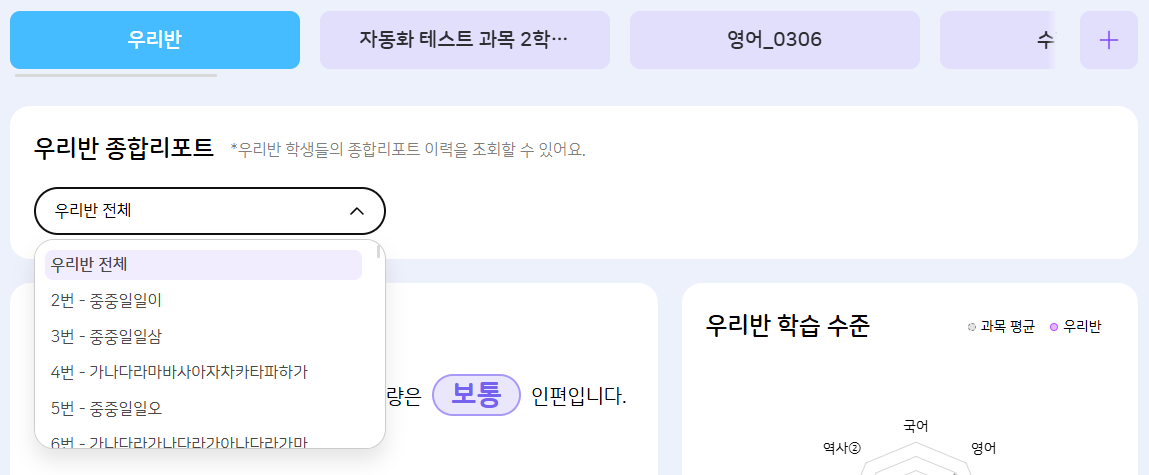 | Steps To Reproduce | AI리포트 > 종합리포트 > 학생 선택 드롭다운 클릭 > 응시 | ||||