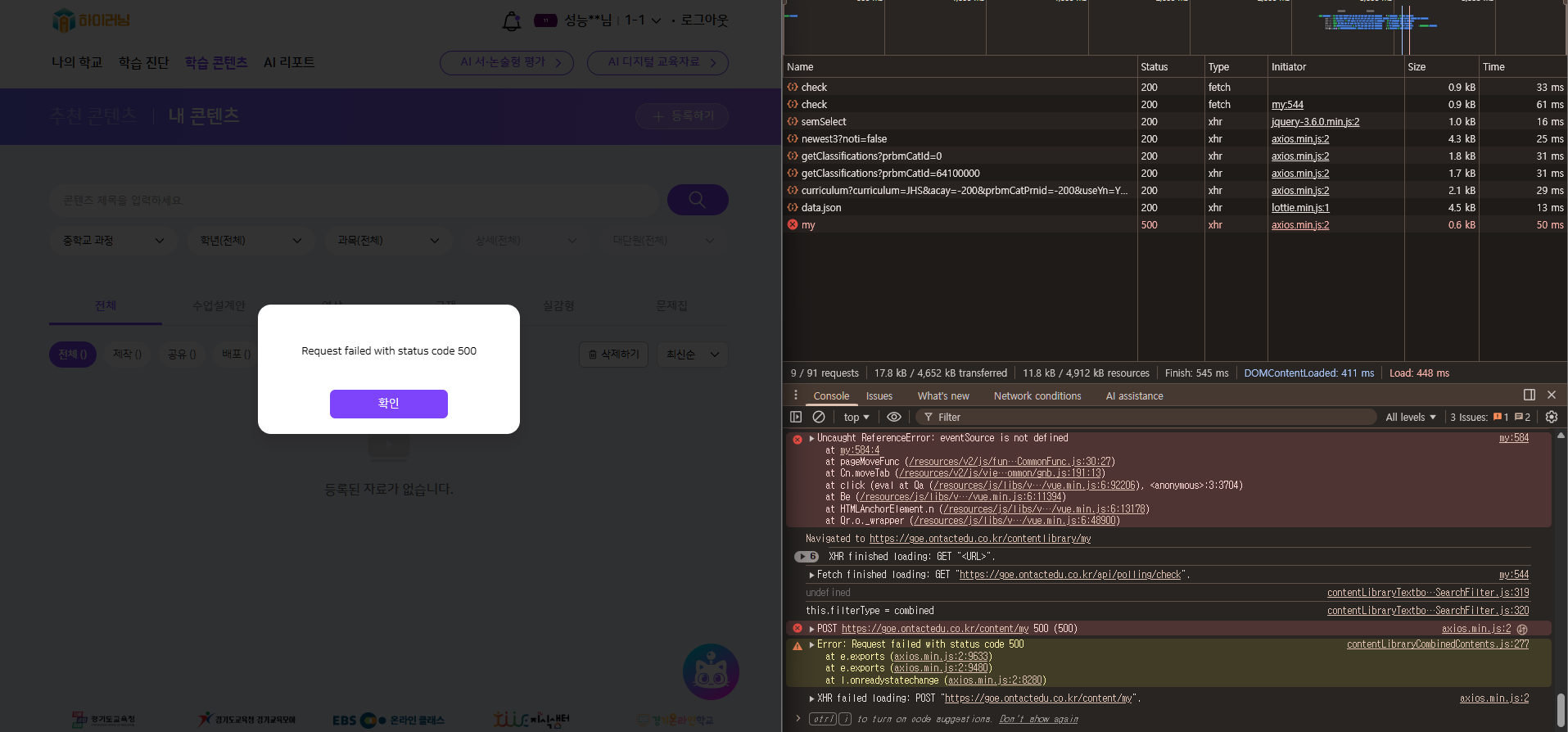 | Description | [수업설계안] 내 콘텐츠 진입 시 500에러 발생 * 교사, 학생 동일 | ||||