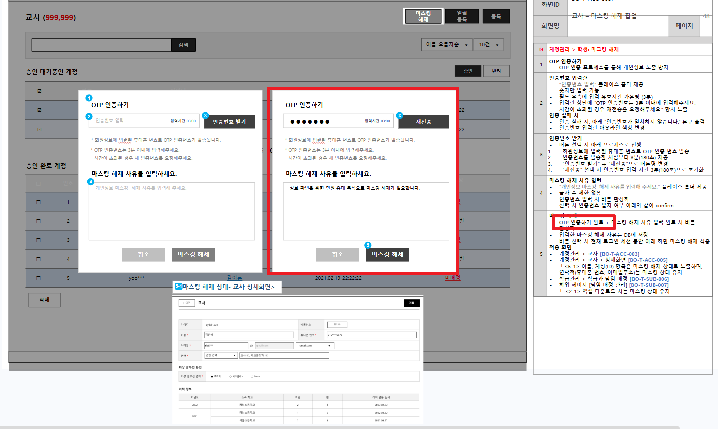 | Summary | 0002095: [마스킹해제][학교BO] 마스킹 해제 팝업(OTP 인증하기) 관련 기획 문의 | ||||