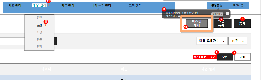 | Description | 마스킹 해제 상태일 때 교사 목록, 학급과 담임 배정 화면의 [마스킹 해제] 버튼은 변경되는 것이 있을지, 아니면 해제 상태에 관계 없이 [마스킹 해제] 버튼으로 유지되는지 문의 드립니다. | ||||
