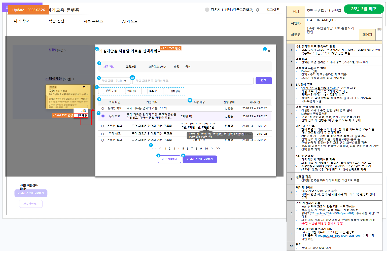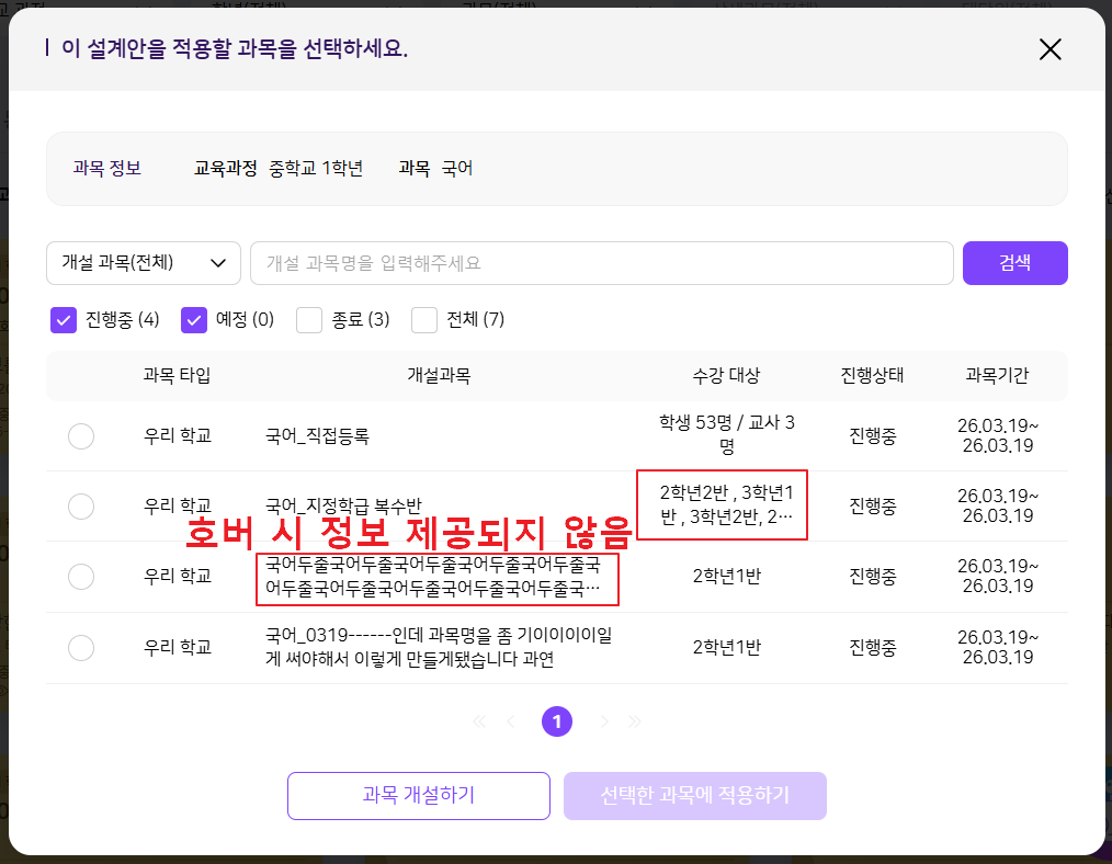 | Description | 수업설계안 바로활용 팝업에서 과목, 수강 대상 호버 기능이 동작하지 않는 현상 | ||||