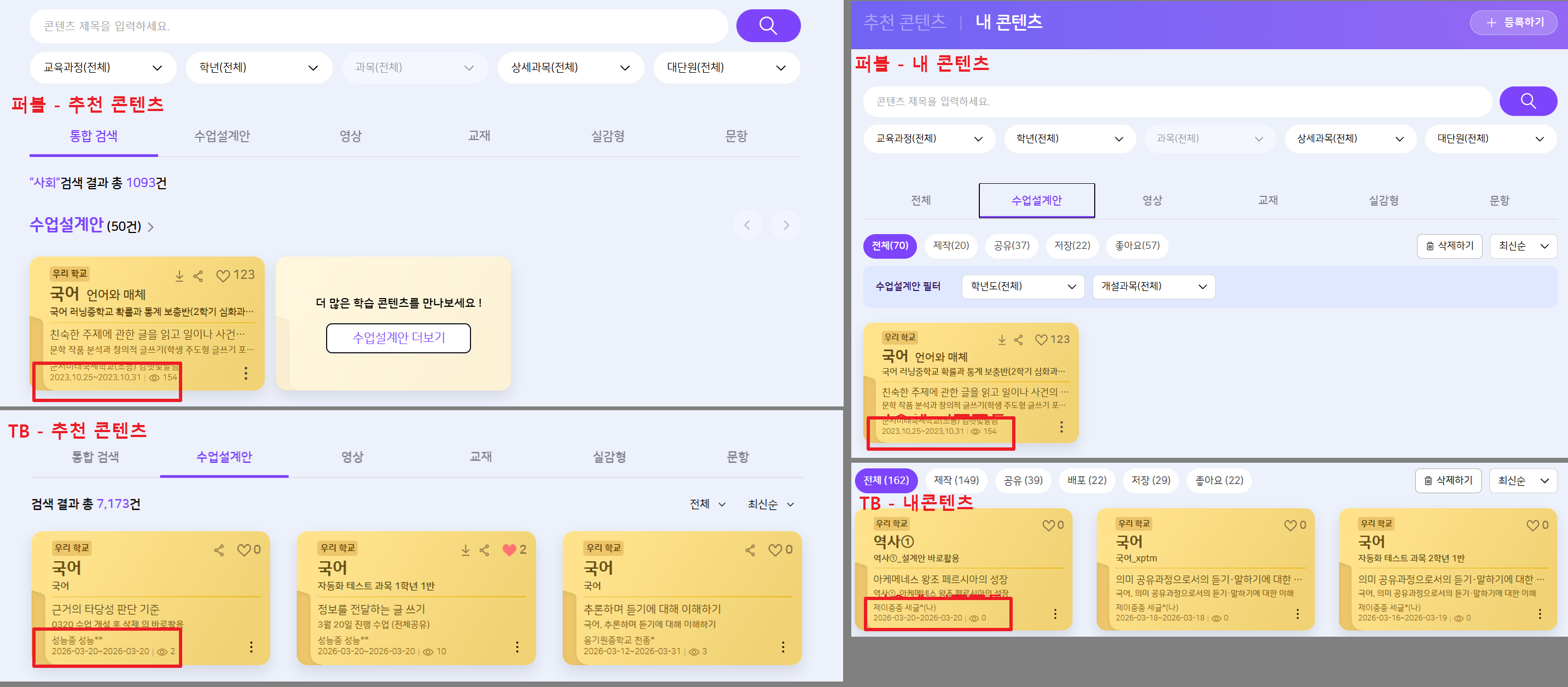 | Description | 추천콘텐츠, 내콘텐츠 수업설계안 카드에서 날짜 형식이 기획과 다른 현상입니다. 퍼블 & 기획 : yyyy.mm.dd 형식 TB 적용 상황 : yyyy-mm-dd | ||||