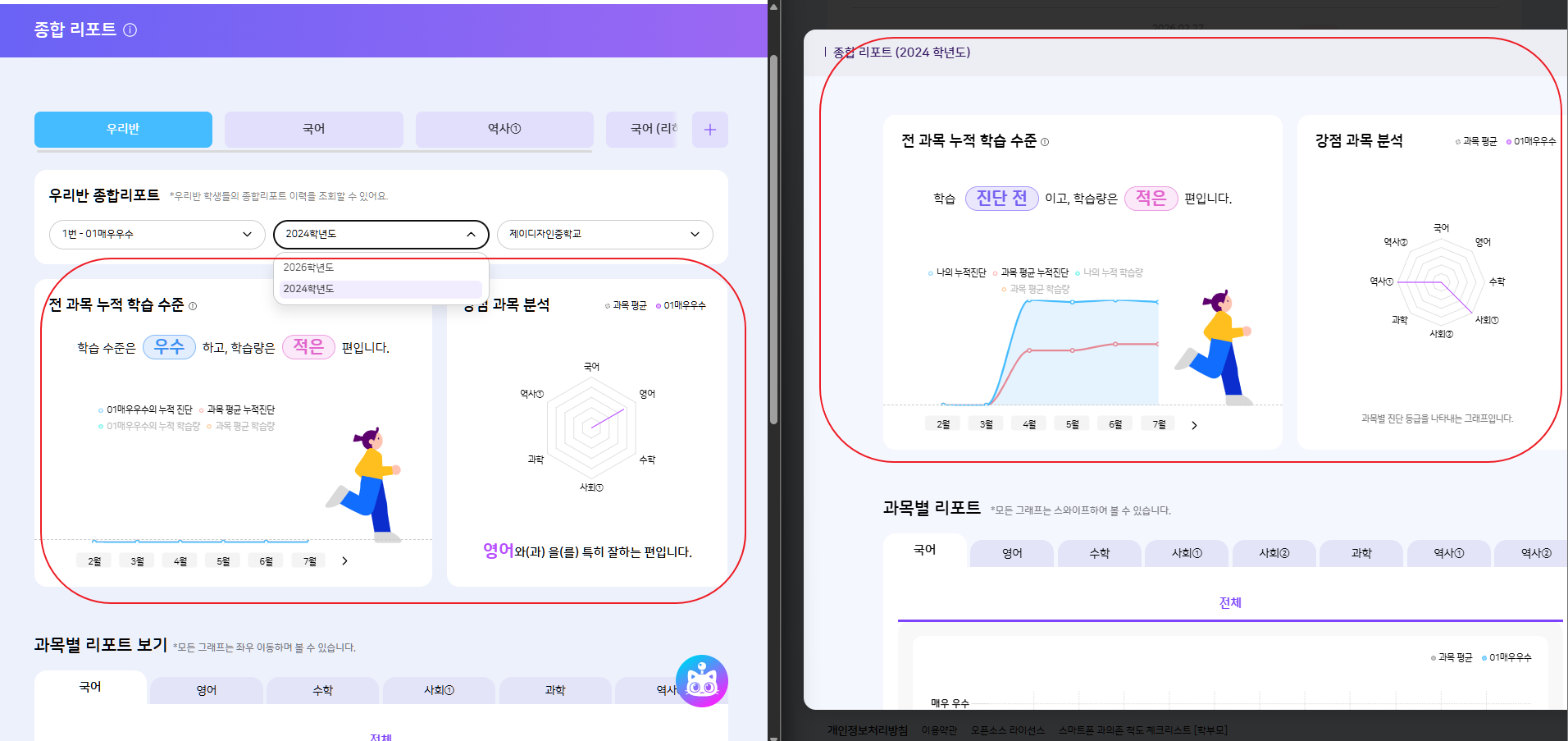 | Steps To Reproduce | 1. 교사 로그인 (jw02) 2. 나의 교실 > 01매우우수 클릭 > 24년 학년도 데이터 클릭 3. 종합 리포트 > 01매우우수 > 24년도 데이터 비교 | ||||