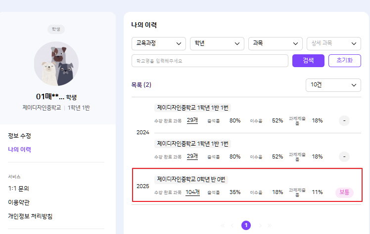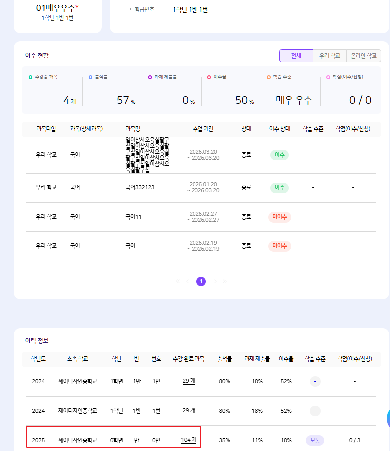 | Steps To Reproduce | [교사] 1. 교사 (jw02) 2. 나의 교실 > 학생상세(01매우우수) 3. 25년 이력 확인 및 학습 수준 클릭 [학생] 1. 제이디자인중학교 1-1-1 2. 마이페이지 > 나의 이력 3. 25년 이력 확인 및 학습 수준 클릭 | ||||