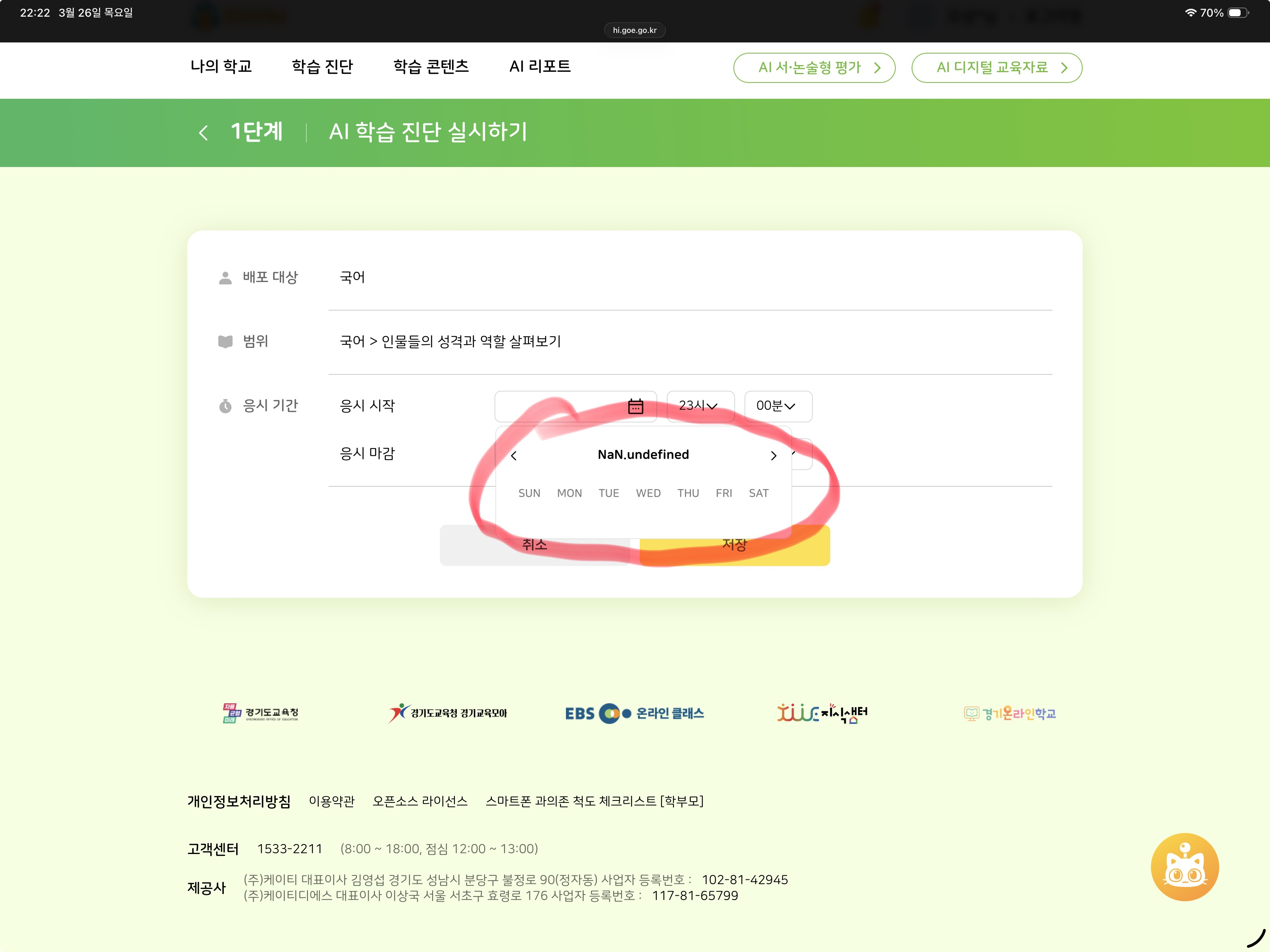 | Description | AI 학습진단 - 기간 수정 화면에서 시작, 종료 날짜가 출력되지 않으며, 날짜 영역 터치 시 "NaN.undefined" 가 출력되는 현상입니다. | ||||