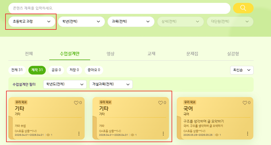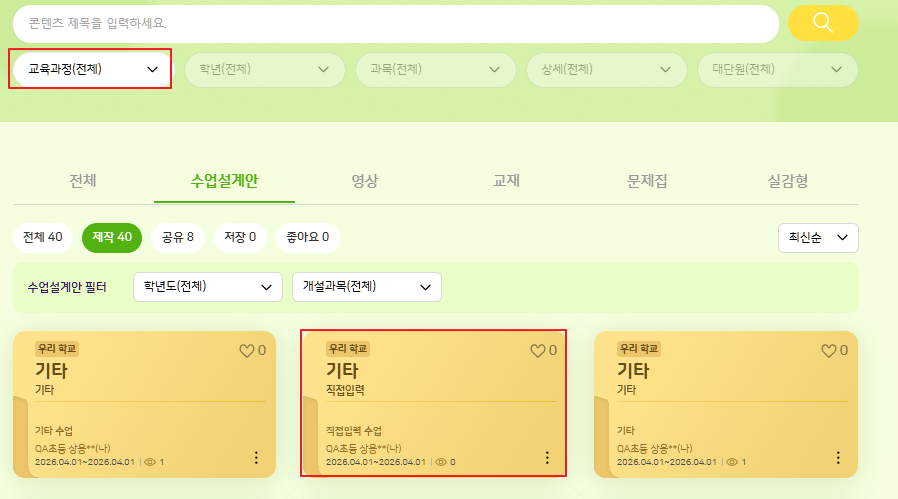 | Description | [수업설계안] 직접입력 과목은 교육과정 필터가 적용되지 않는 현상 *초등, 중등, 고등이 아닌 교육과정(전체)에만 노출 | ||||