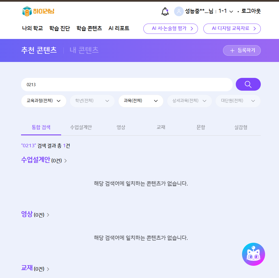 | Description | 추천콘텐츠 - 구분류체계 콘텐츠를 검색하지 못하는 현상 내 콘텐츠 - 교육과정(전체) 구분류 콘텐츠 노출 해당 콘텐츠(공유설정이 우리학교 이상)를 추천콘텐츠에서(교육과정 전체) 검색 시 콘텐츠가 노출되지 않음 | ||||