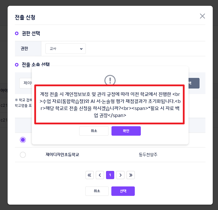 | Steps To Reproduce | 1. 학교BO 로그인 2. 계정관리 - 전출 진입 3. "10최용운" 검색 후 [전출 신청] 버튼 클릭 4. 전출 소속 선택 > "제이디" 검색 후 임의의 학교 체크 5. [선택] 버튼 클릭 | ||||