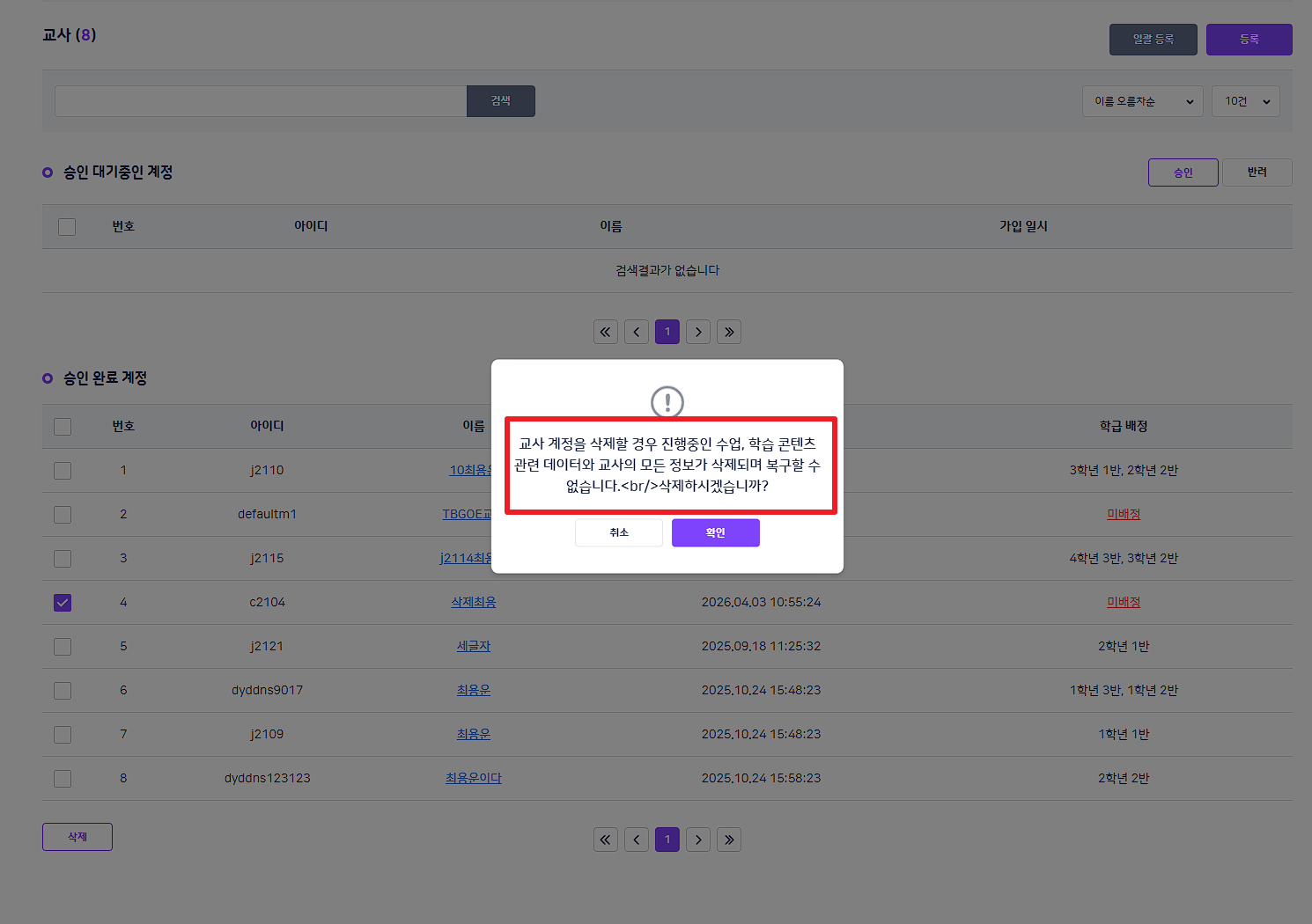 | Steps To Reproduce | 1. 학교BO 로그인 2. 계정관리 > 교사 진입 3. 미배정 상태 교사 체크 > [삭제] 버튼 클릭 | ||||
