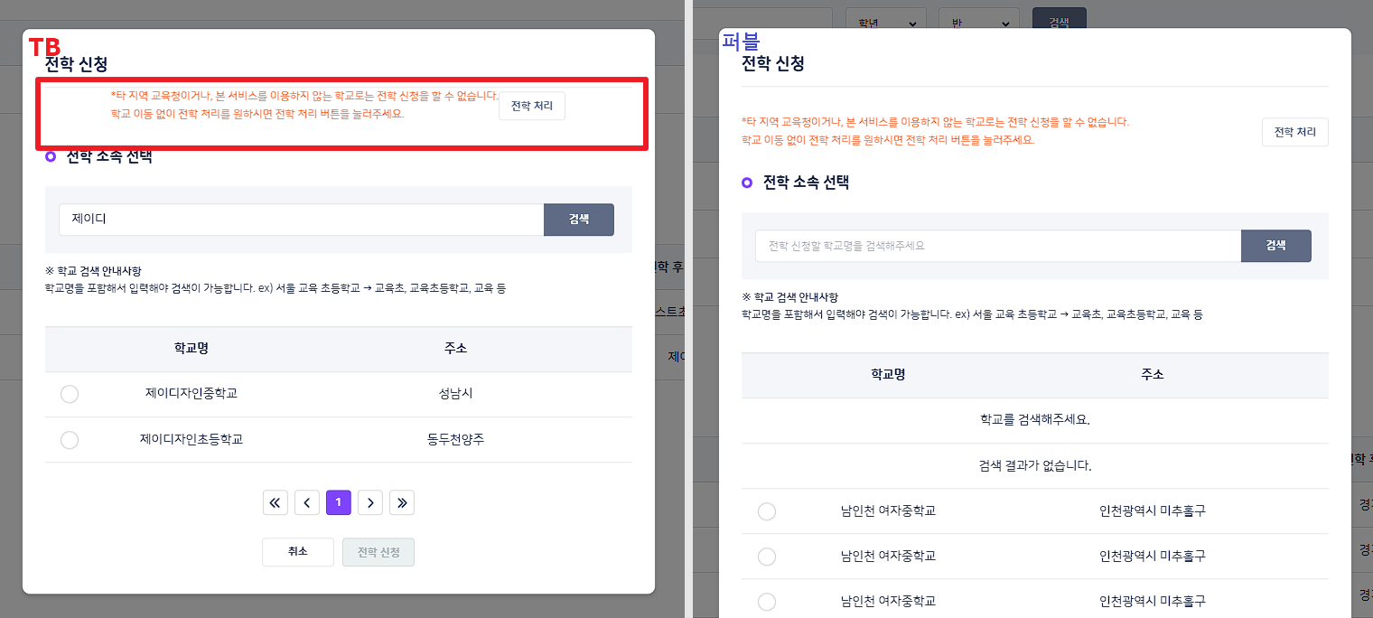 | Description | 전학 신청 팝업 - 전학 처리 영역 UI가 퍼블과 다르게 출력되는 현상입니다. | ||||