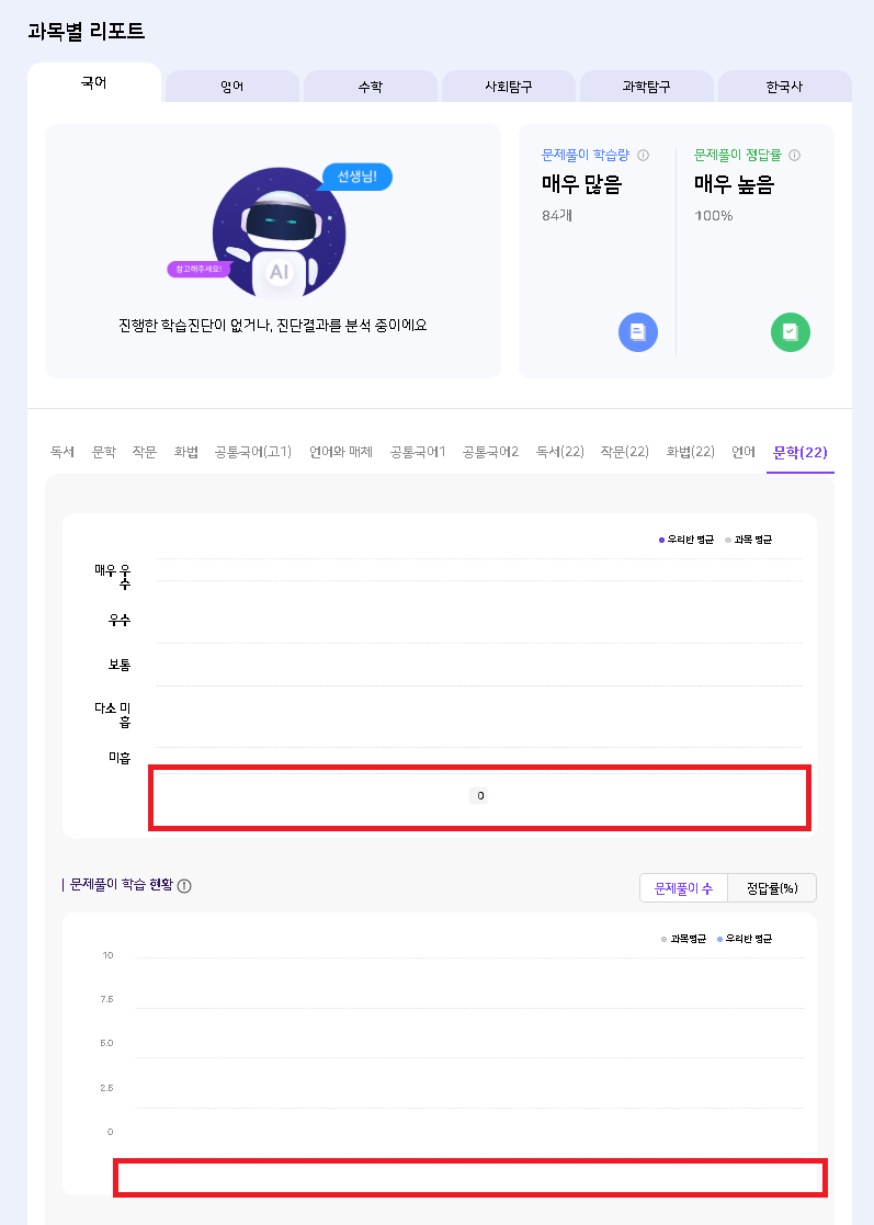 | Steps To Reproduce | 과목 리포트 > 국어 > 독서(22),작문(22) 등 신 분류 상세 과목 클릭 > 응시 | ||||