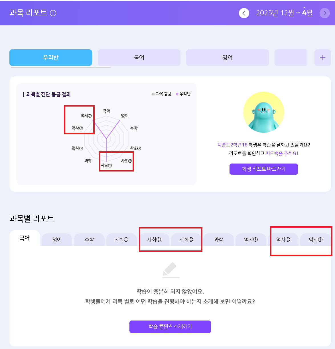 | Description | [디폴트][분류체계]중학교 - 과목,종합 리포트 일부 과목 2개씩 노출되는 현상 사회2, 역사2가 합쳐지지 않고 2개씩 노출되는 현상입니다. | ||||