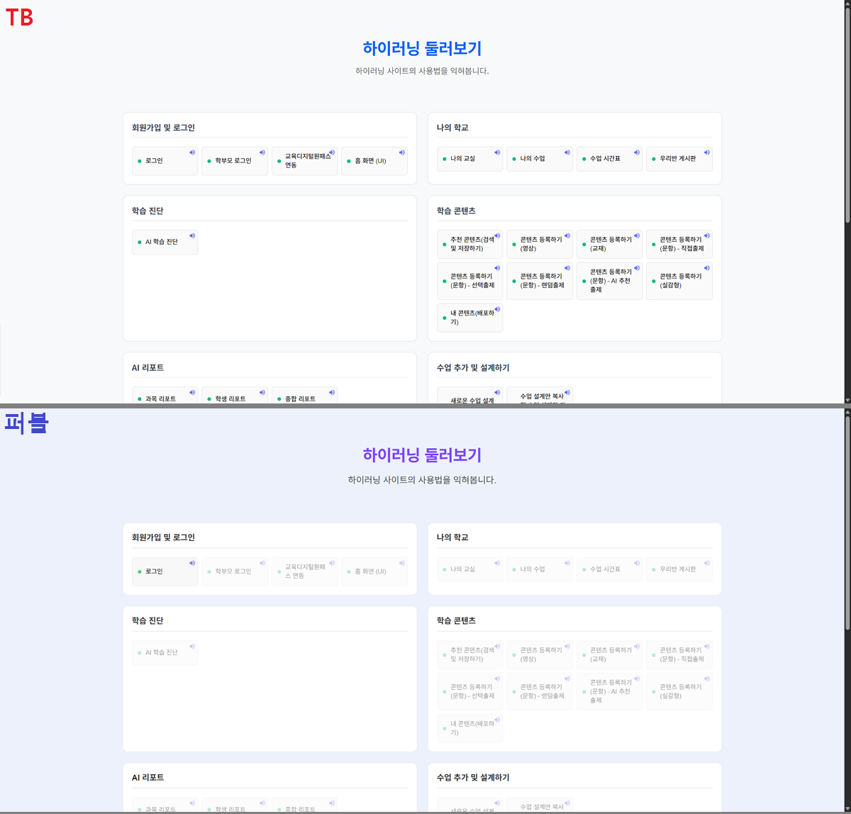 | Description | 둘러보기 페이지의 타이틀 텍스트 색상과 배경색이 퍼블과 상이한 현상입니다. - TB : 파란색 텍스트, 회색 배경 - 퍼블 : 보라색 텍스트, 보라색 배경 | ||||