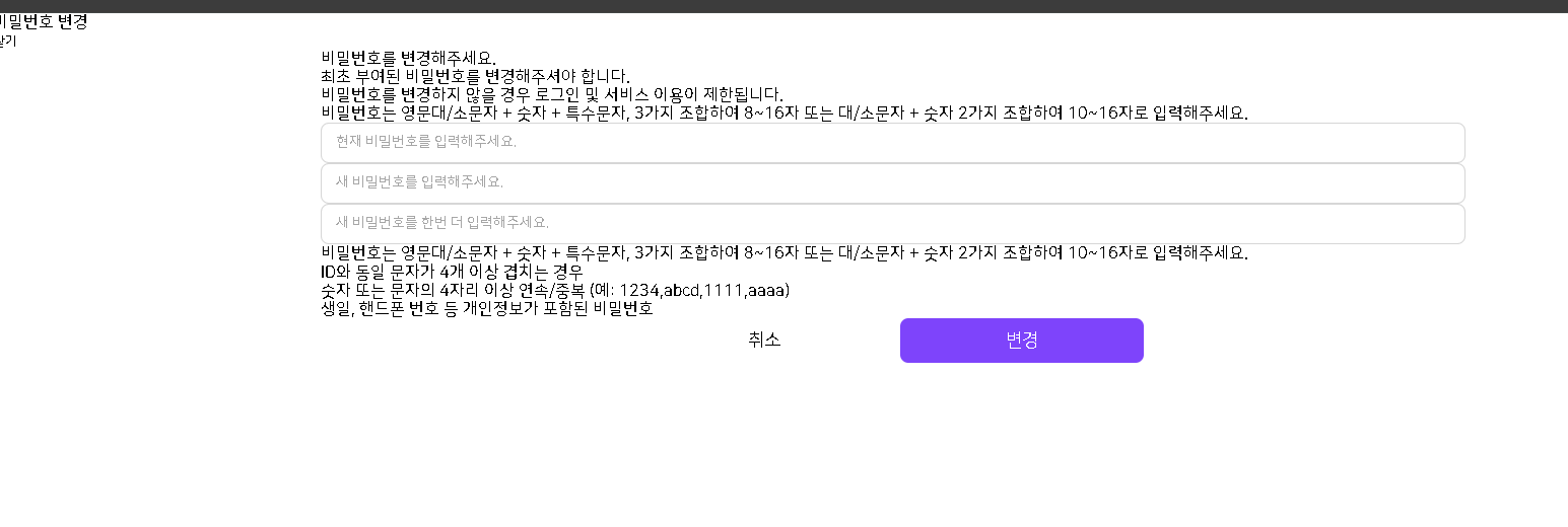 해당 해당 화면은 확인 결과 팝업이 아닌, 페이지 이동을 통해 노출되는 별도의 '비밀번호 변경' 페이지입니다. 현재 퍼블리싱 파일 역시 별도 HTML로 구분되어 업로드된 상태입니다. 말씀하신 화면은 인트로 전용 스타일이 아닌 기존 공통 스타일을 따르는 페이지이므로 기존 CSS(common.css, subpage.css)를 연결하시면 정상적으로 노출됩니다. 해당 화면을 이번에 새로 만든 전용 CSS를 연결하실 계획인가요? |