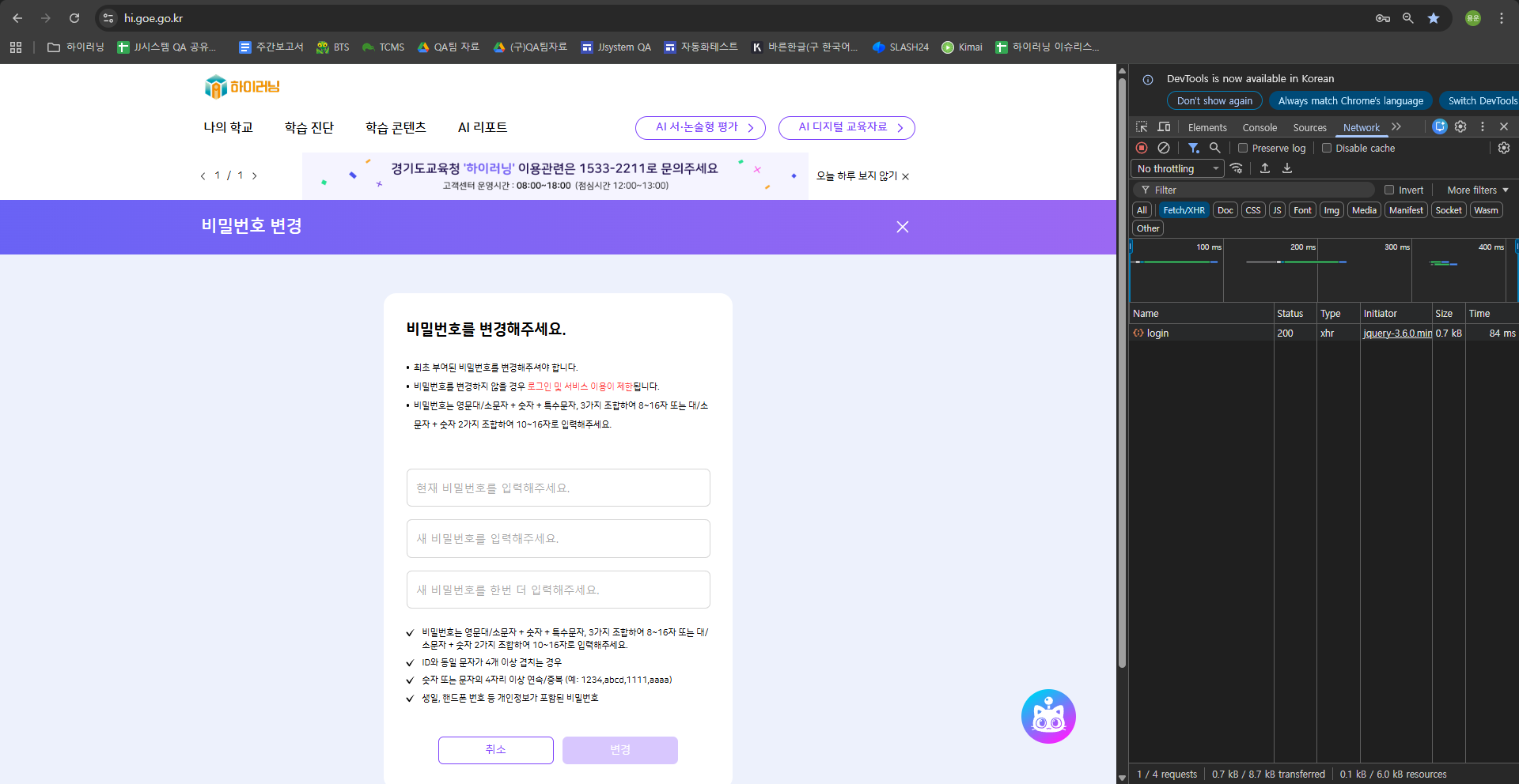 | Description | [인트로]비밀번호 변경 페이지 UI깨지는 현상 발생 학생, 교사, 학부모 모두 동일하게 노출됩니다. | ||||