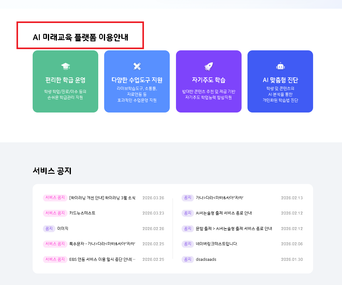 | Description | [인트로] 이용안내 영역 텍스트 상용과 상이한 부분 발생 현재 TB에는 "AI 미래교육 플랫폼 이용안내" 라고 되어 있는데 -> "경기도교육청 하이러닝 이용안내"로 변경되어야합니다. (상용 기준으로 일치) | ||||