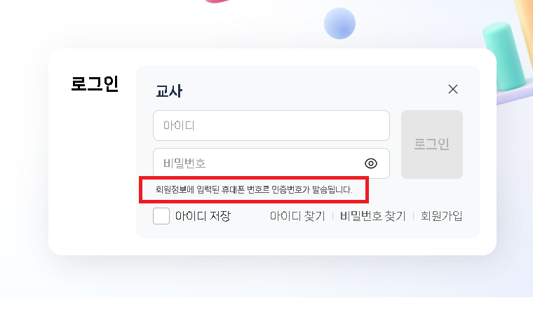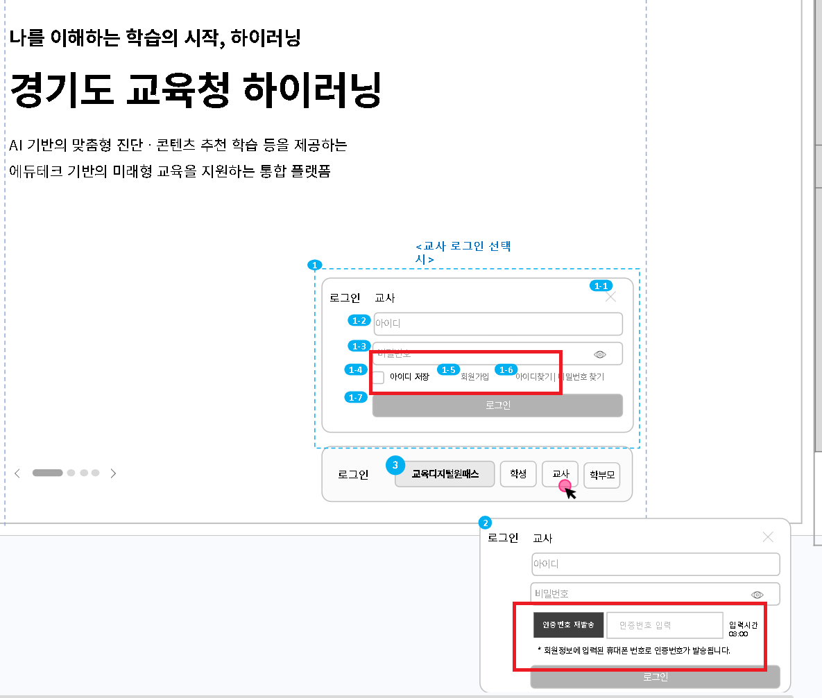 | Description | [인트로]교사 로그인 폼 - 인증번호 안내 텍스트 기획과 상이 기획 : 기본 상태에선 인증번호 관련 안내 텍스트 없음, 인증번호 입력란 활성화시 안내 텍스트 노출 | ||||
