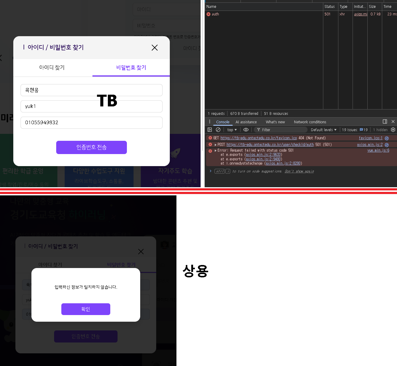 | Description | [인트로]아이디/비밀번호 찾기 시 실패 팝업 미노출 되는 현상 상용 : 탈퇴한 아이디입니다, 입력하신 정보가 일치하지 않습니다 등의 실패 사유 팝업으로 노출됨 TB : 실패사유 팝업 노출 안됨. | ||||