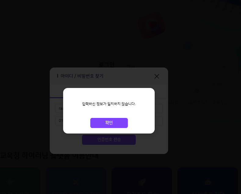 | Steps To Reproduce | 인트로 > 교사 > 아이디/비밀번호 찾기 > 탈퇴한 계정, 없는 계정 등으로 입력 > 응시 | ||||
