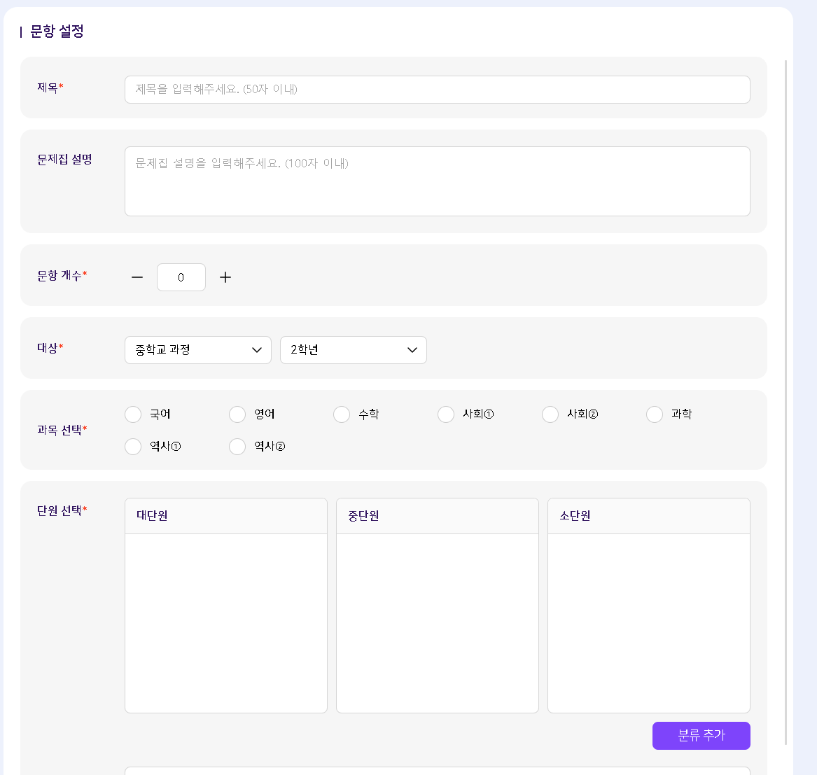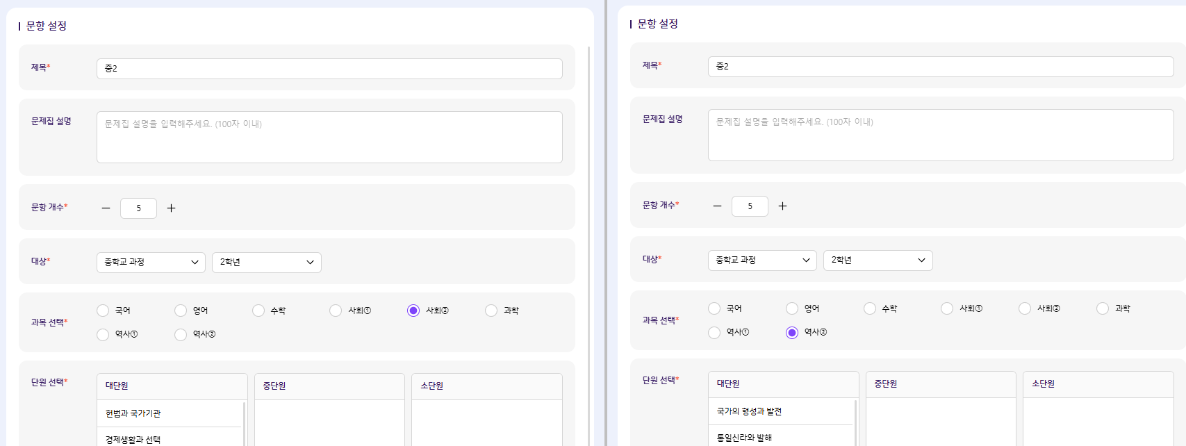 | Description | [분류체계]중2 - 학습 콘텐츠 - 문항 구분류 사회2,역사2 생성 할 수 있는 현상 과목 선택 영역에 사회2, 사회2, 역사2, 역사2 노출됨 + 클릭시 단원 변경 및 생성까지 가능합니다. | ||||