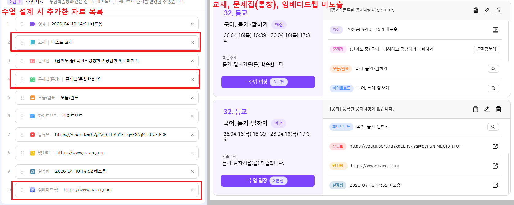 | Description | [통창공유고도화]수업 생성 시 통창 문제집, 임베디드 웹 추가 후 저장하면 수업 카드에 콘텐츠 노출 안되는 현상 1. 문제집(통창)+임베디드 웹만 추가 후 수업 저장 시 : 노출됨 2. 영상,교재,문제집,모둠/발표,화이트보드,유튜브,웨URL,실감형 등 기존 콘텐츠 + 문제집(통창), 임베디드 웹 저장시 : 노출 안됨 | ||||