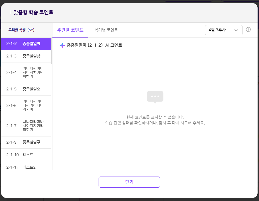 | Steps To Reproduce | 1. 교사 계정 로그인 2. AI 리포트 > 학생 리포트 진입 3. "우리반 AI 코멘트 요약을 확인하세요" 영역 클릭 4. 학생 주간별, 학기별 코멘트 확인 | ||||