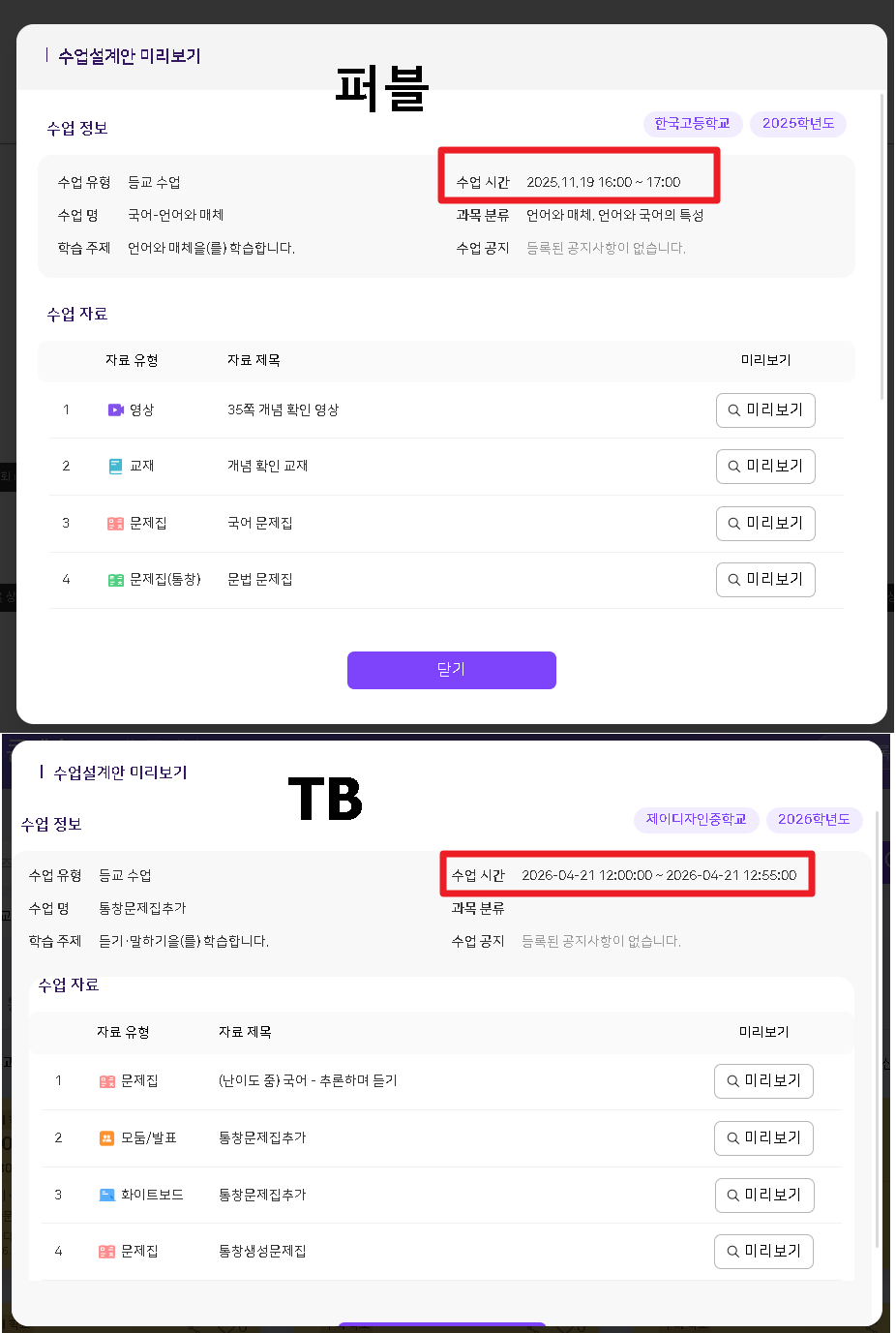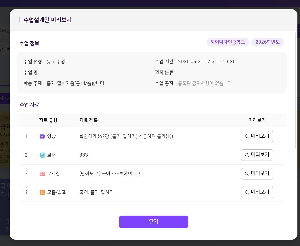 | Steps To Reproduce | 수업 설계안 카드 클릭 > 수업설계안 미리보기 팝업 수업시간 확인 | ||||