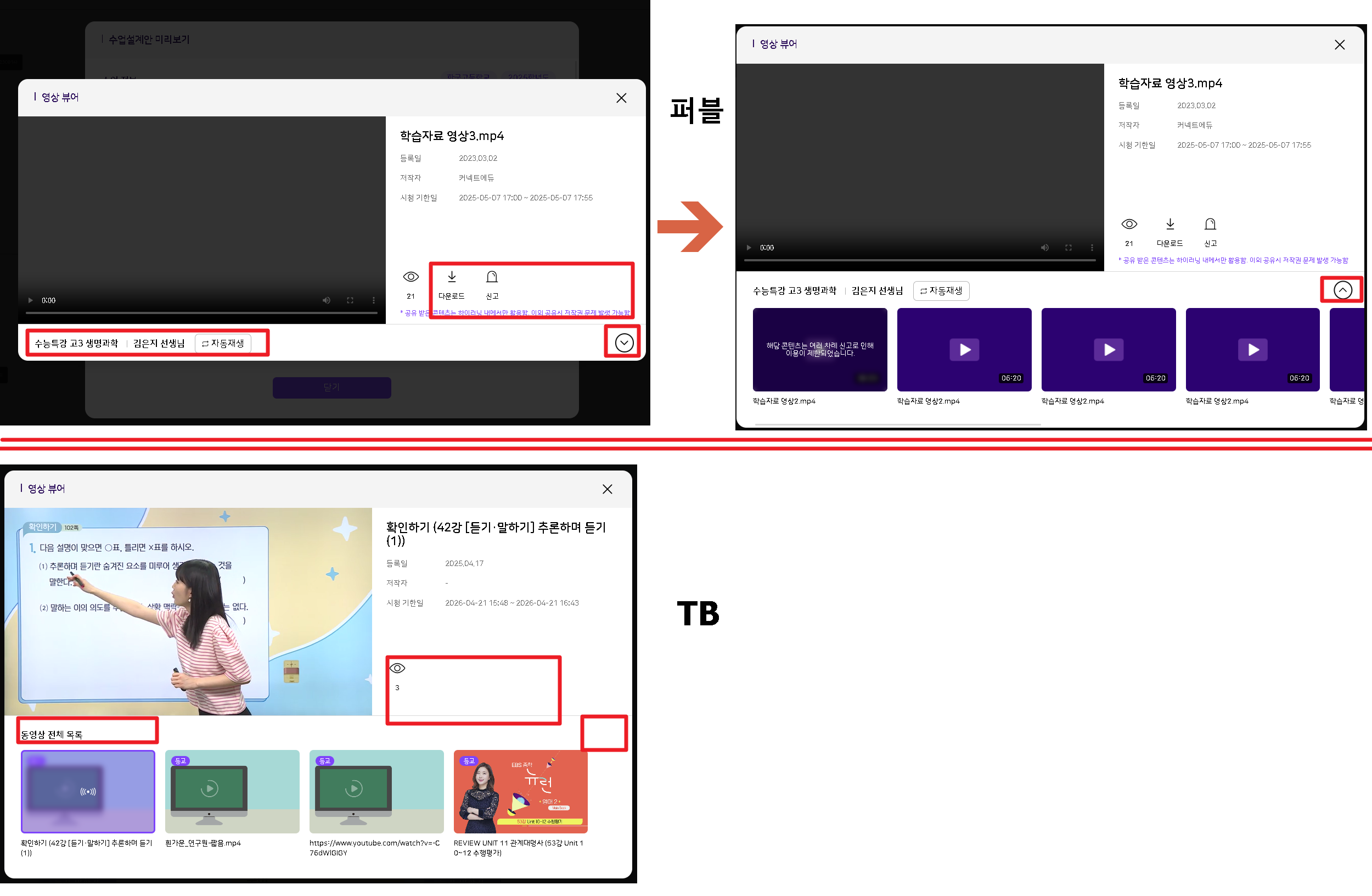 | Description | [수업설계안 미리보기]영상 - 미리보기 팝업 퍼블과 상이 퍼블 1. 디폴트 : 하단부 영상 목록 숨김 2. 영상 출처 | 000 선생님 표기 3. [자동 재생] 버튼 노출 4. 영상 목록 숨기기 / 펼치기 버튼 제공 5. 다운로드, 신고, 안내 텍스트 제공 | ||||