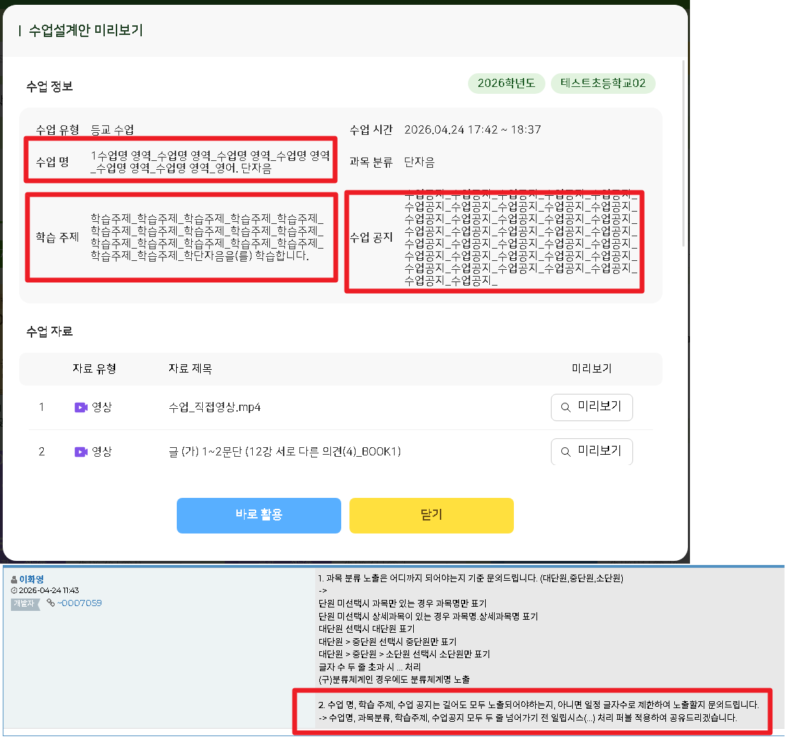 | Description | [수업설계안 미리보기]수업 명, 학습 주제, 수업 공지 글자수 제한되지 않는 현상 두 줄 넘어가기 전 말줌임효(...) 처리 되어야합니다. (이슈번호 : 2263 참고) | ||||