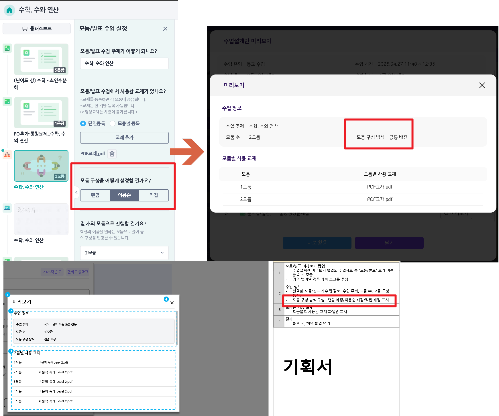 | Description | [수업설계안 미리보기]모둠/발표 - 모둠 구성 방식 노출 되는 명이 기획과 상이함 통창에서 구성 설정 : 랜덤/이름순/직접 기획 : 랜덤 배정/이름순 배정/ 직접 배정 TB : 공통 방식 | ||||