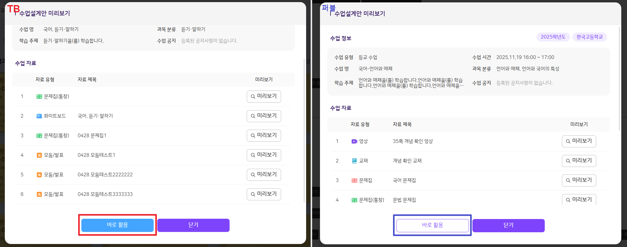 | Description | 수업설계안 미리보기 팝업 내 [바로 활용] 버튼 색상이 퍼블과 상이한 현상입니다. | ||||