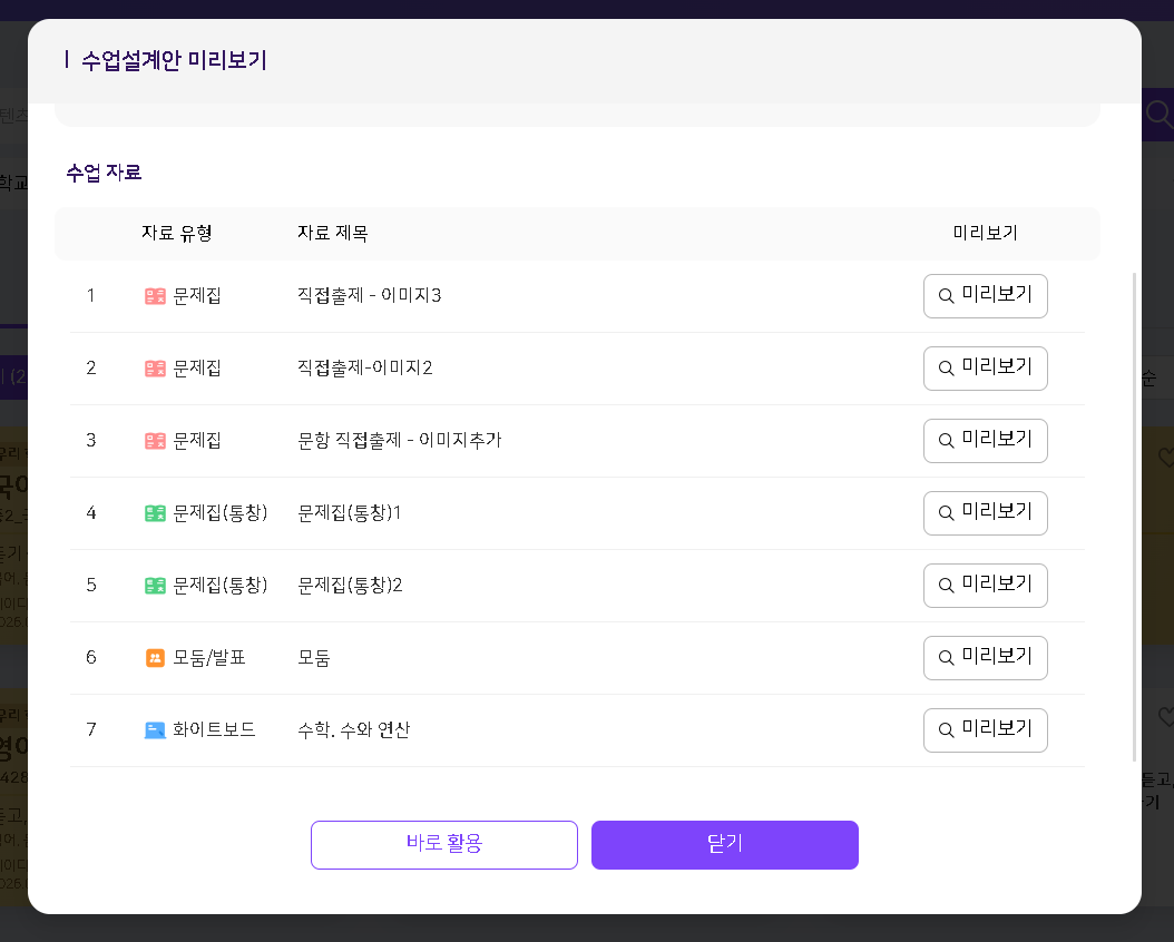 | Summary | 0002290: [수업설계안 미리보기] 수업설계안 미리보기 팝업 내 '바로활용' 버튼이 퍼블과 상이한 현상 | ||||