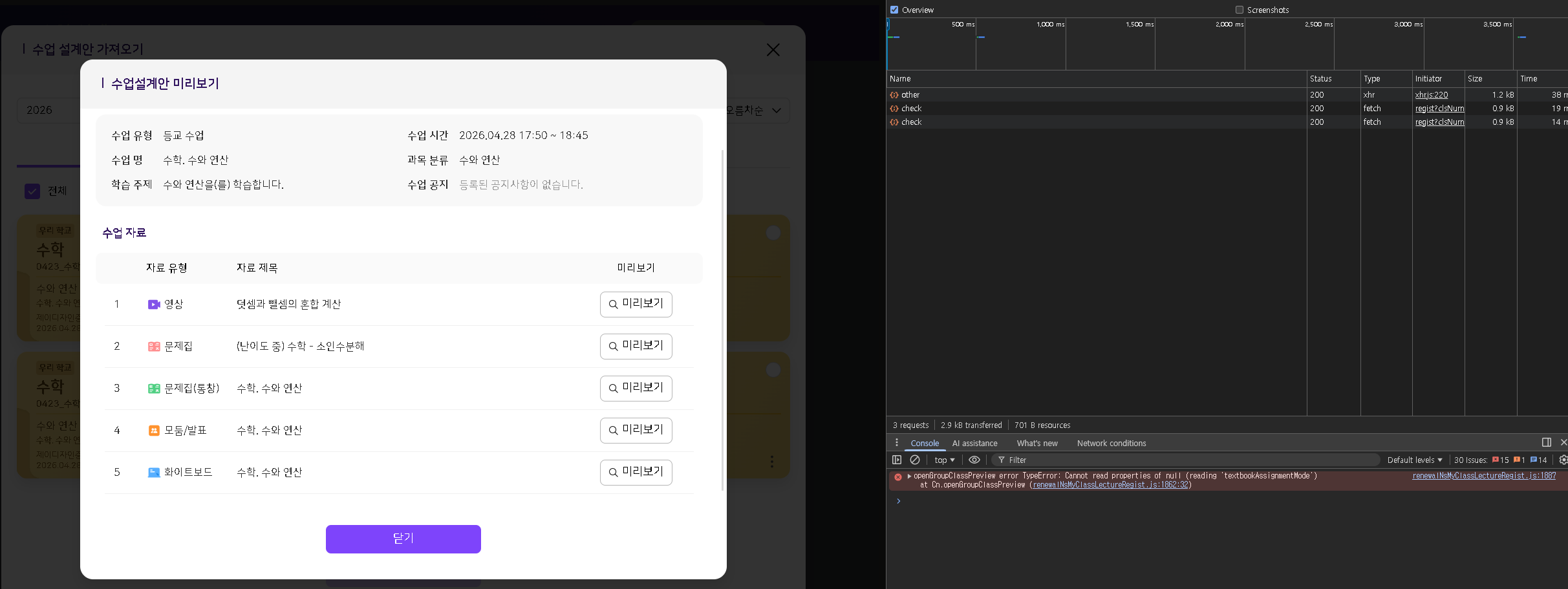 | Description | [통창공유고도화]수업 설계안 가져오기 - 데이터 없는 모둠/발표 클릭 시 반응 없음 기대 결과 : "해당 수업 자료는 정보가 없어 미리보기를 제공할 수 없습니다...." 팝업 노출 | ||||