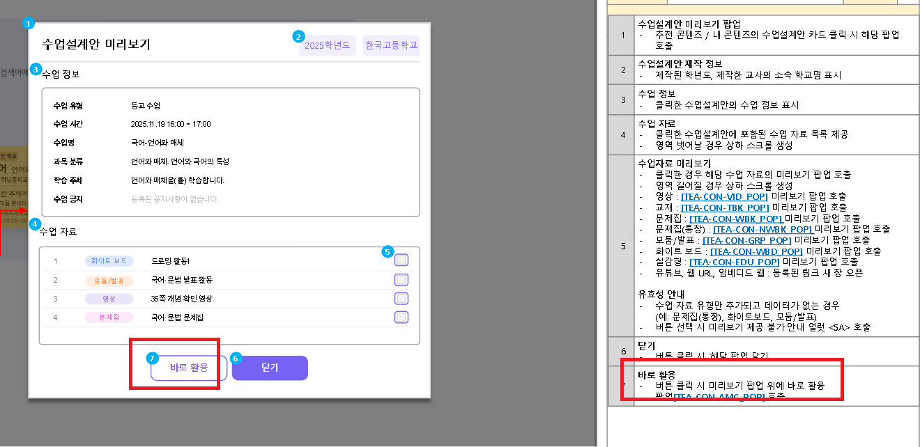 | Description | [수업설계안 미리보기]바로활용 닫기 클릭시 수업 설계안 미리보기 팝업 종료되는 현상 기획서 : 미리보기 팝업 위에 바로활용 호출 퍼블 : 바로활용 팝업 종료 시 수업설계안 미리보기 팝업 유지 | ||||