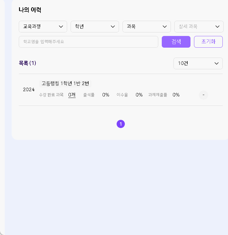 | Steps To Reproduce | 1. 이력이 있는 학생 로그인 2. 마이페이지>나의 이력>검색 3. 초기화>팝업-확인버튼 클릭 4. 목록 응시 | ||||