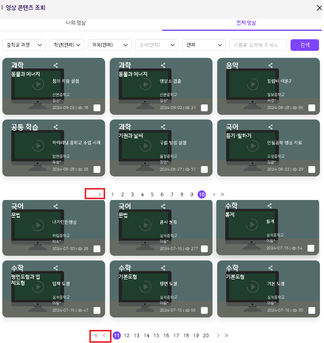 | Steps To Reproduce | 1. 나의학교>나의수업>수업설계하기 2. 수업자료>영상 직접 추가>영상 콘텐츠 조회>찾아보기 3. 영상 콘텐츠 조회 팝업 페이지네이션 응시 | ||||